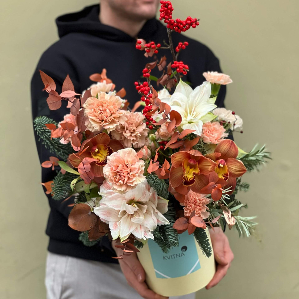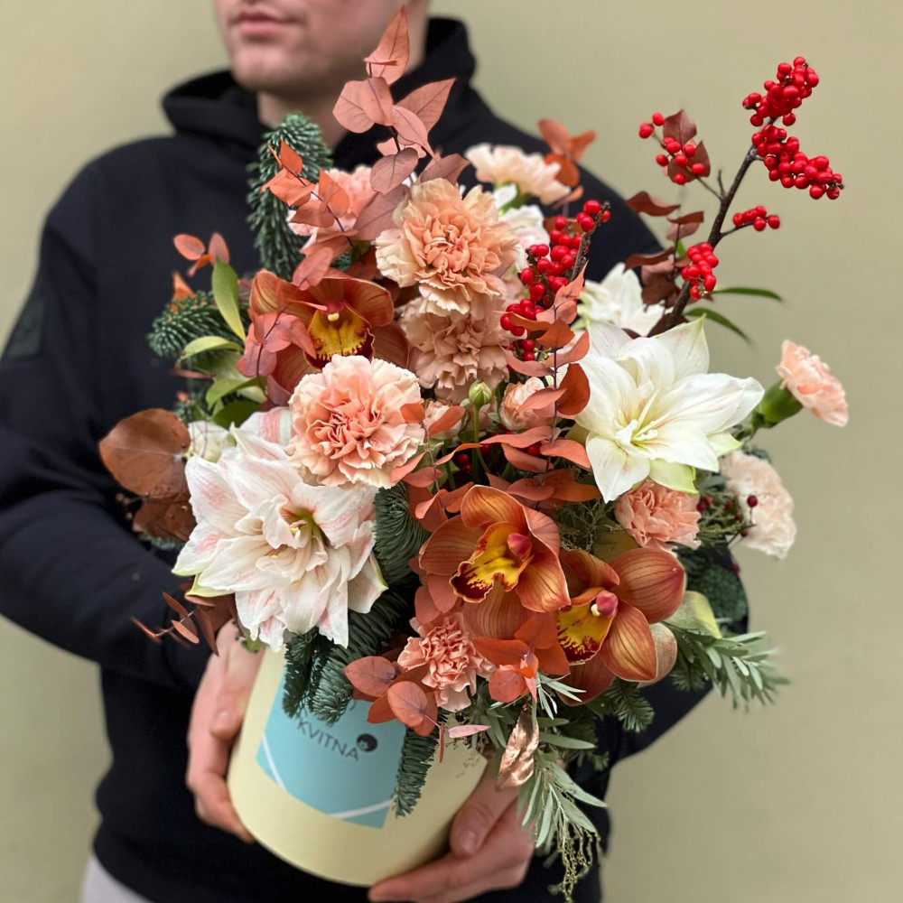 Нехай композиція (коробка, кошик, сніп) з квітами від Квітна тішить Вас якнайдовше!