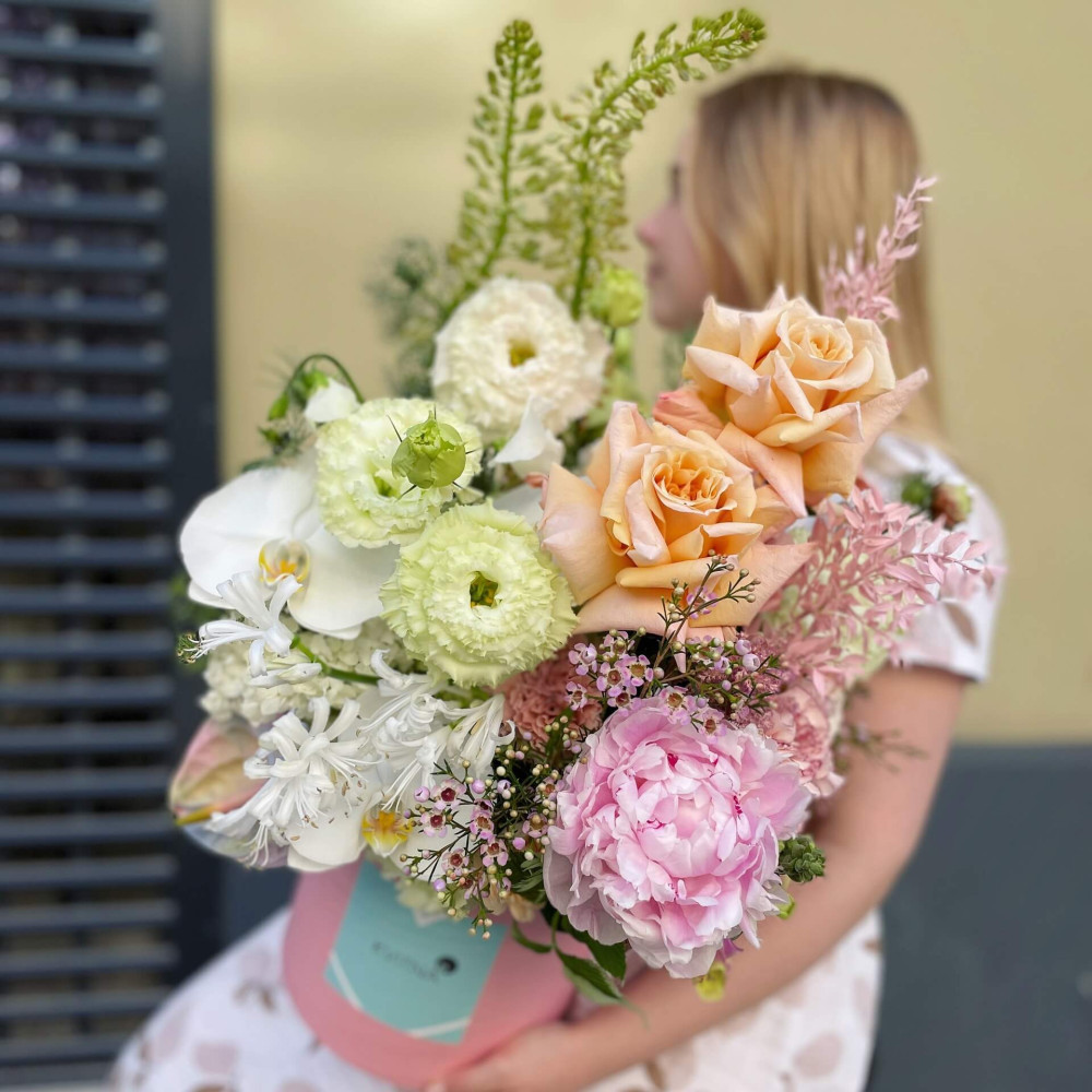 Квіти: Еустома, Троянда, Півонія, Фаленопсис, Хамелаціум, Рускус, Антуріум, Неріне