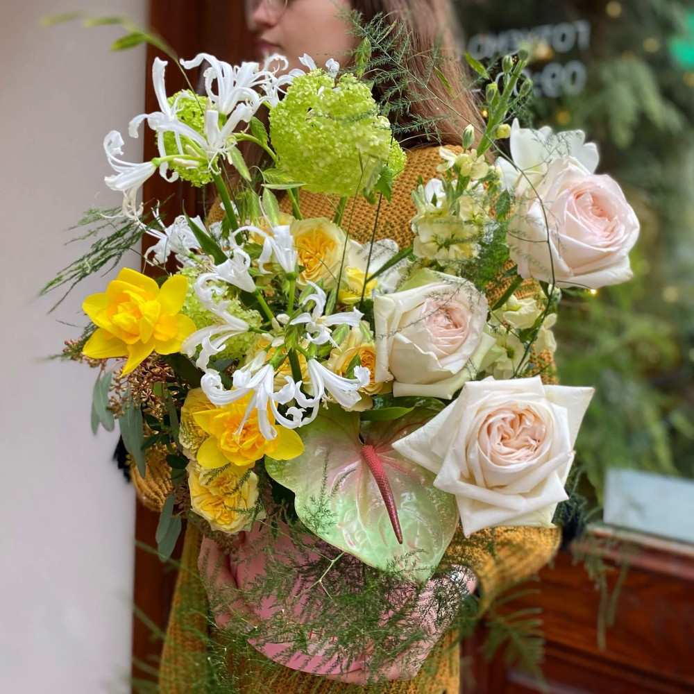 Квіти: Антуріум, Троянда піоновидна, Нарцис, Неріне, Вібурнум, Матіола, Аспарагус