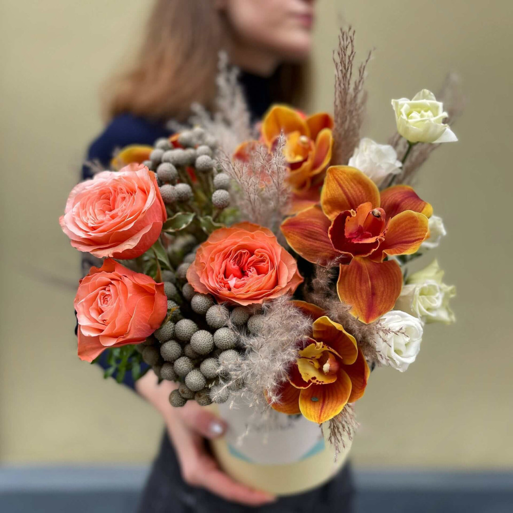 Нехай композиція (коробка, кошик, сніп) з квітами від Квітна тішить Вас якнайдовше!