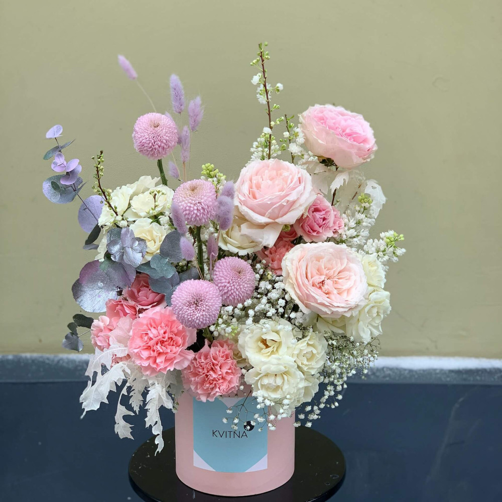 Нехай композиція (коробка, кошик, сніп) з квітами від Квітна тішить Вас якнайдовше!