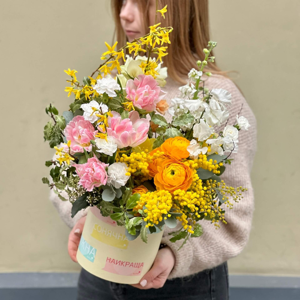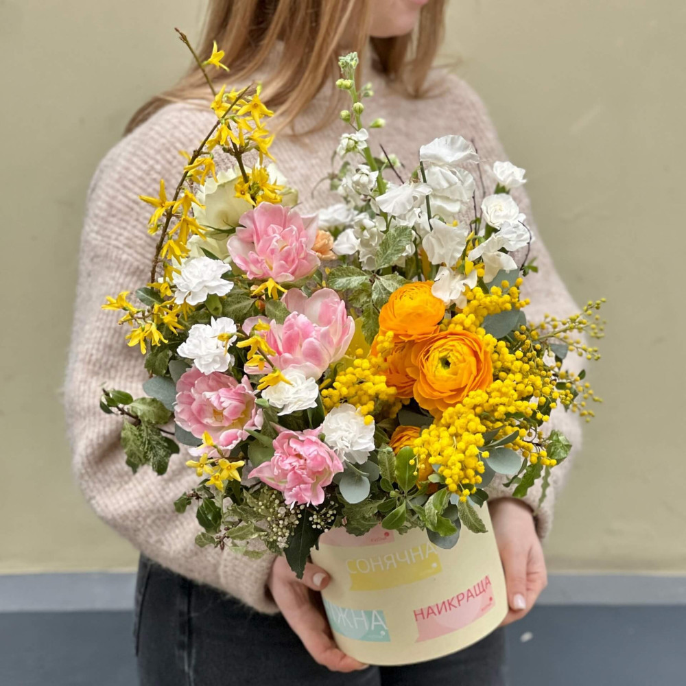 Квіти: Ранункулюс, Троянда, Тюльпан, Матіола, Діантус, Форзиція, Мімоза, Латірус, Евкаліпт