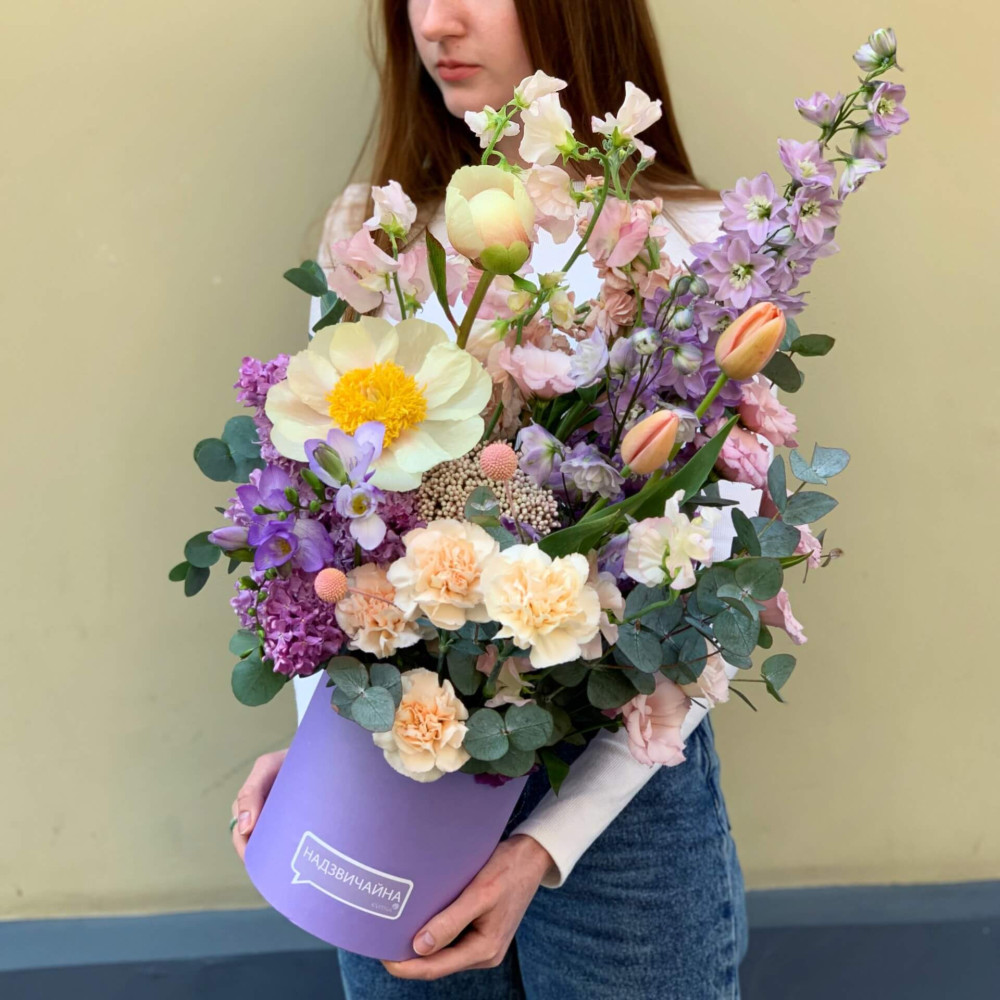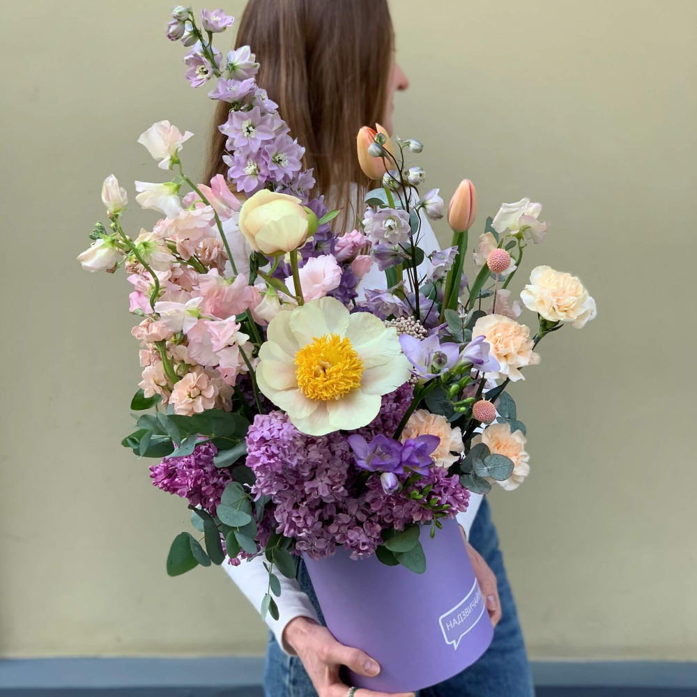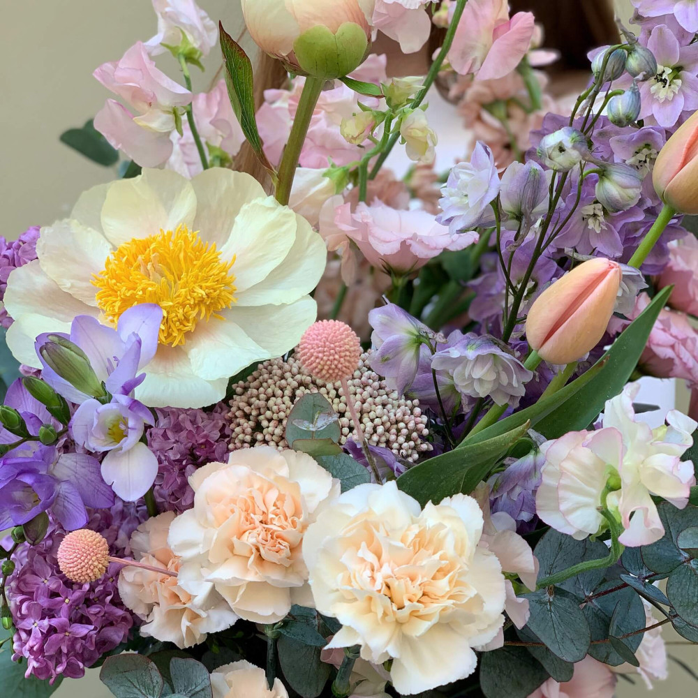 Квіти: Півонія, Бузок, Матіола, Діантус, Тюльпан, Дельфініум, Фрезія, Латірус