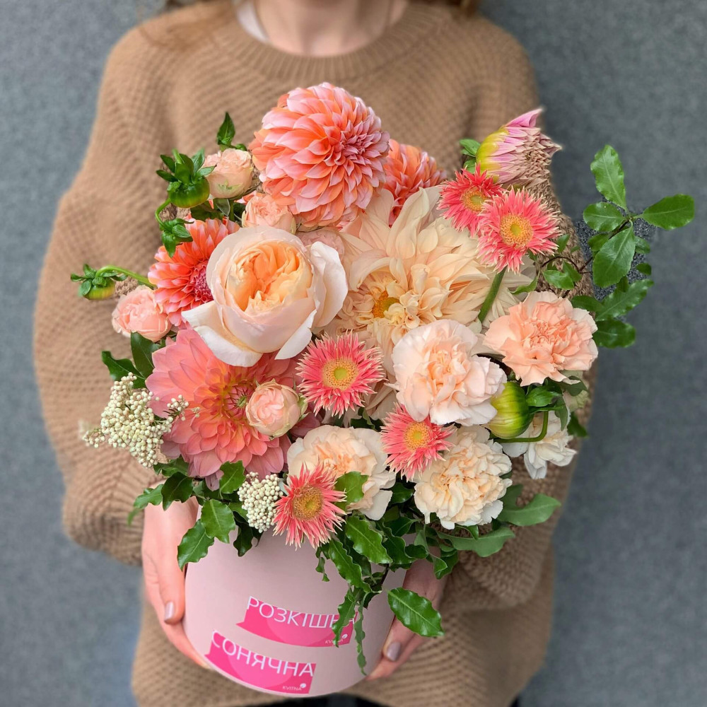 Нехай композиція (коробка, кошик, сніп) з квітами від Квітна тішить Вас якнайдовше!