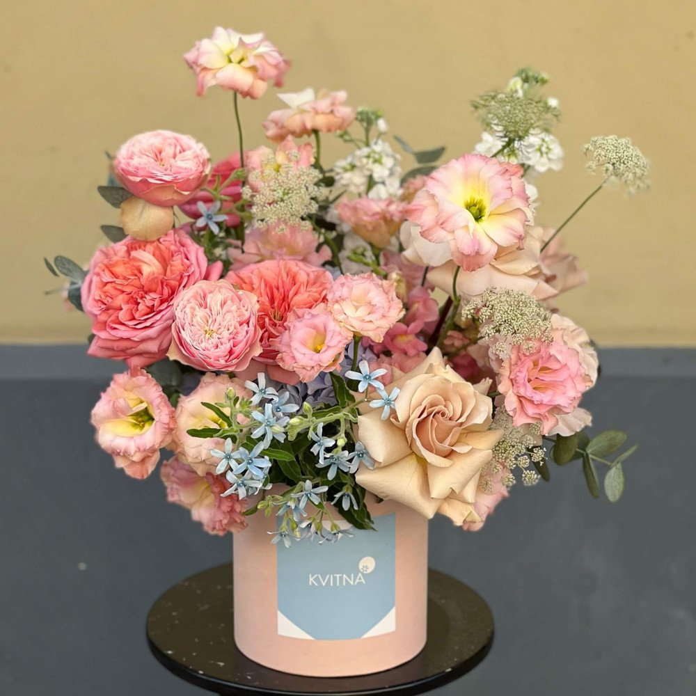 Нехай композиція (коробка, кошик, сніп) з квітами від Квітна тішить Вас якнайдовше!