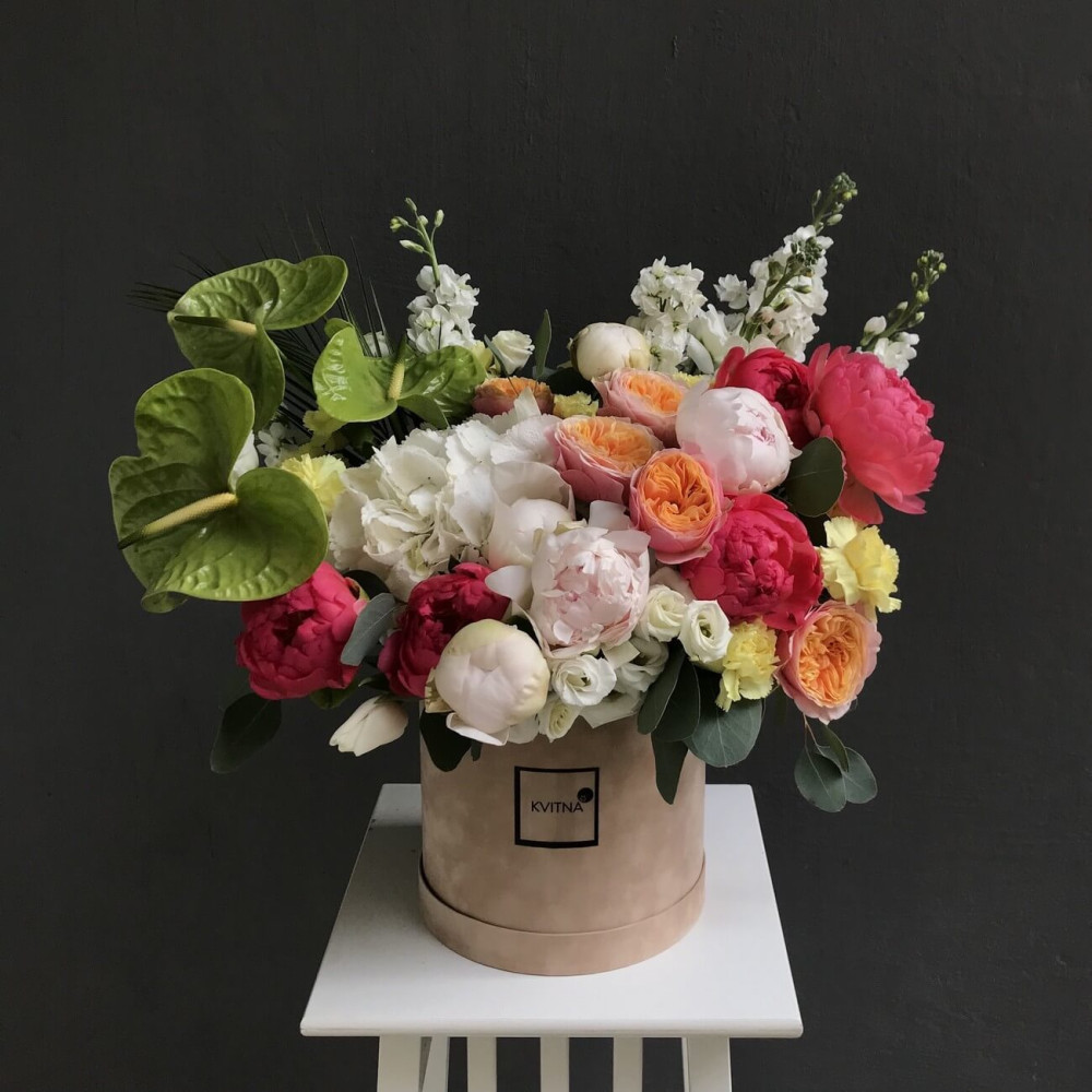 Нехай композиція (коробка, кошик, сніп) з квітами від Квітна тішить Вас якнайдовше!