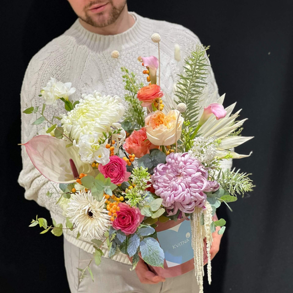 Нехай композиція (коробка, кошик, сніп) з квітами від Квітна тішить Вас якнайдовше!