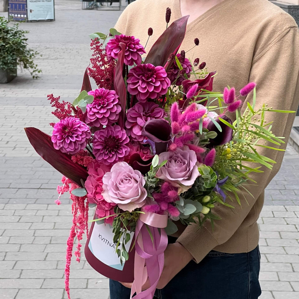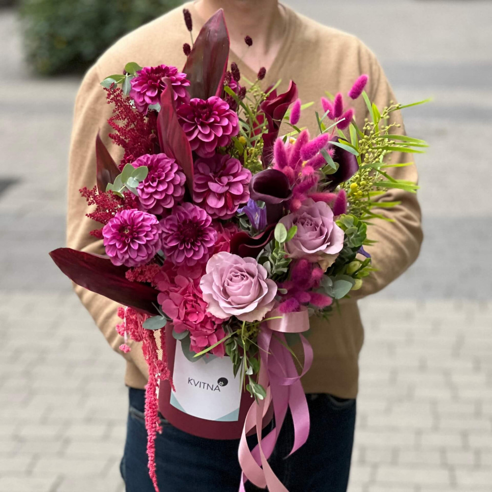Нехай композиція (коробка, кошик, сніп) з квітами від Квітна тішить Вас якнайдовше!