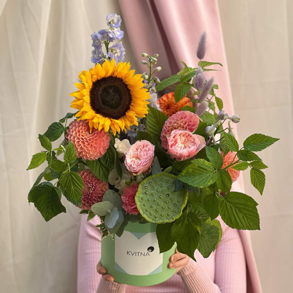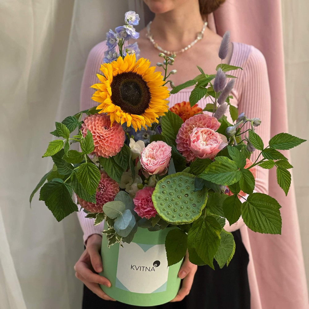 Нехай композиція (коробка, кошик, сніп) з квітами від Квітна тішить Вас якнайдовше!