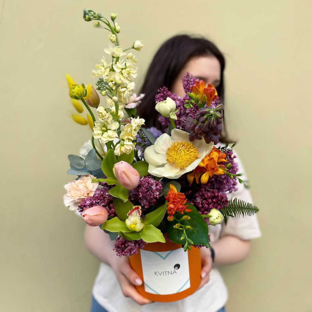 Цветы: Пион, Сирень, Маттиола, Тюльпан, Фрезия, Диантус, Эвкалипт, Цимбидиум