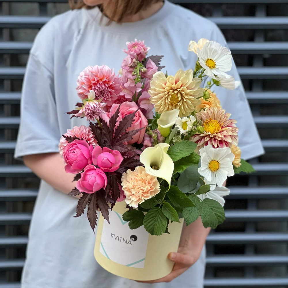 Нехай композиція (коробка, кошик, сніп) з квітами від Квітна тішить Вас якнайдовше!