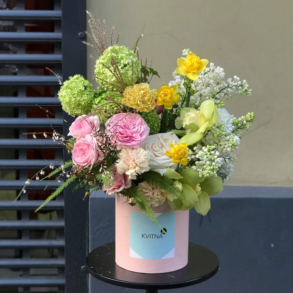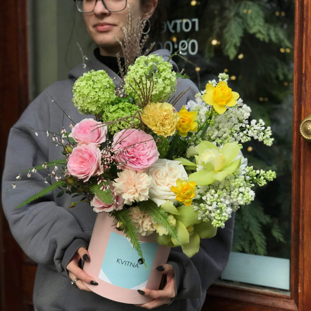 Нехай композиція (коробка, кошик, сніп) з квітами від Квітна тішить Вас якнайдовше!