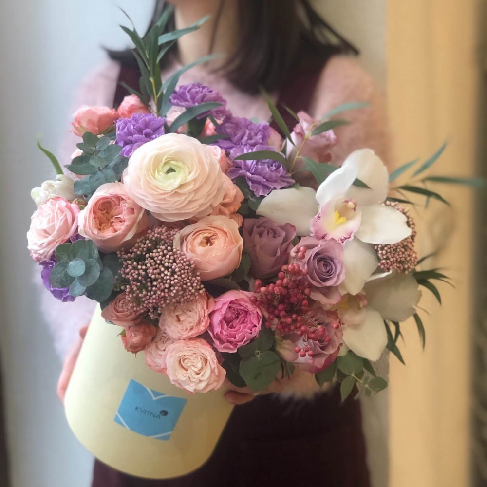 Нехай композиція (коробка, кошик, сніп) з квітами від Квітна тішить Вас якнайдовше!