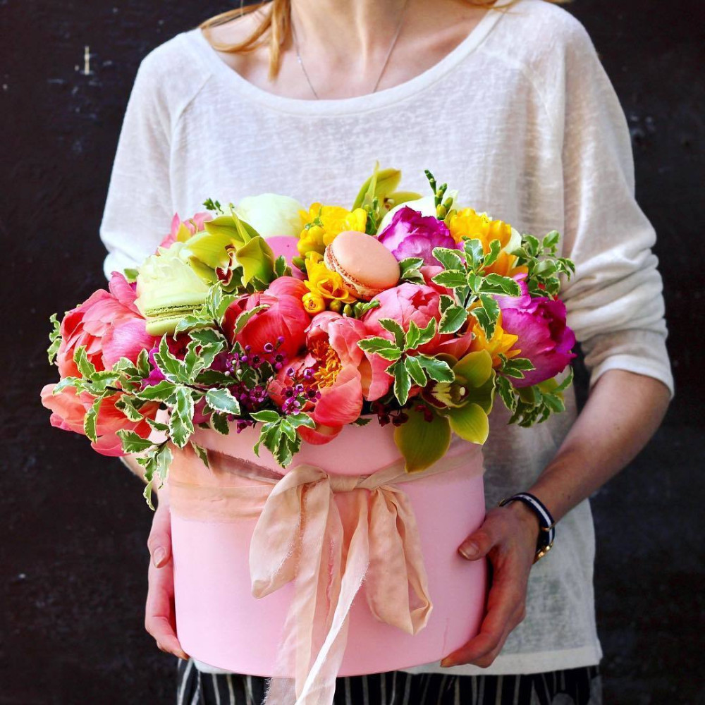 - Як замовити Яскрава капелюшна коробка з квітами «Карамель»? ❯