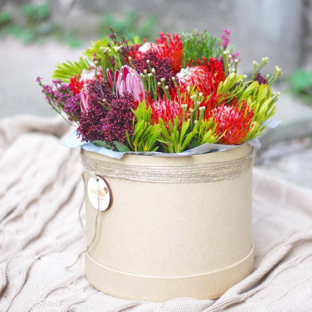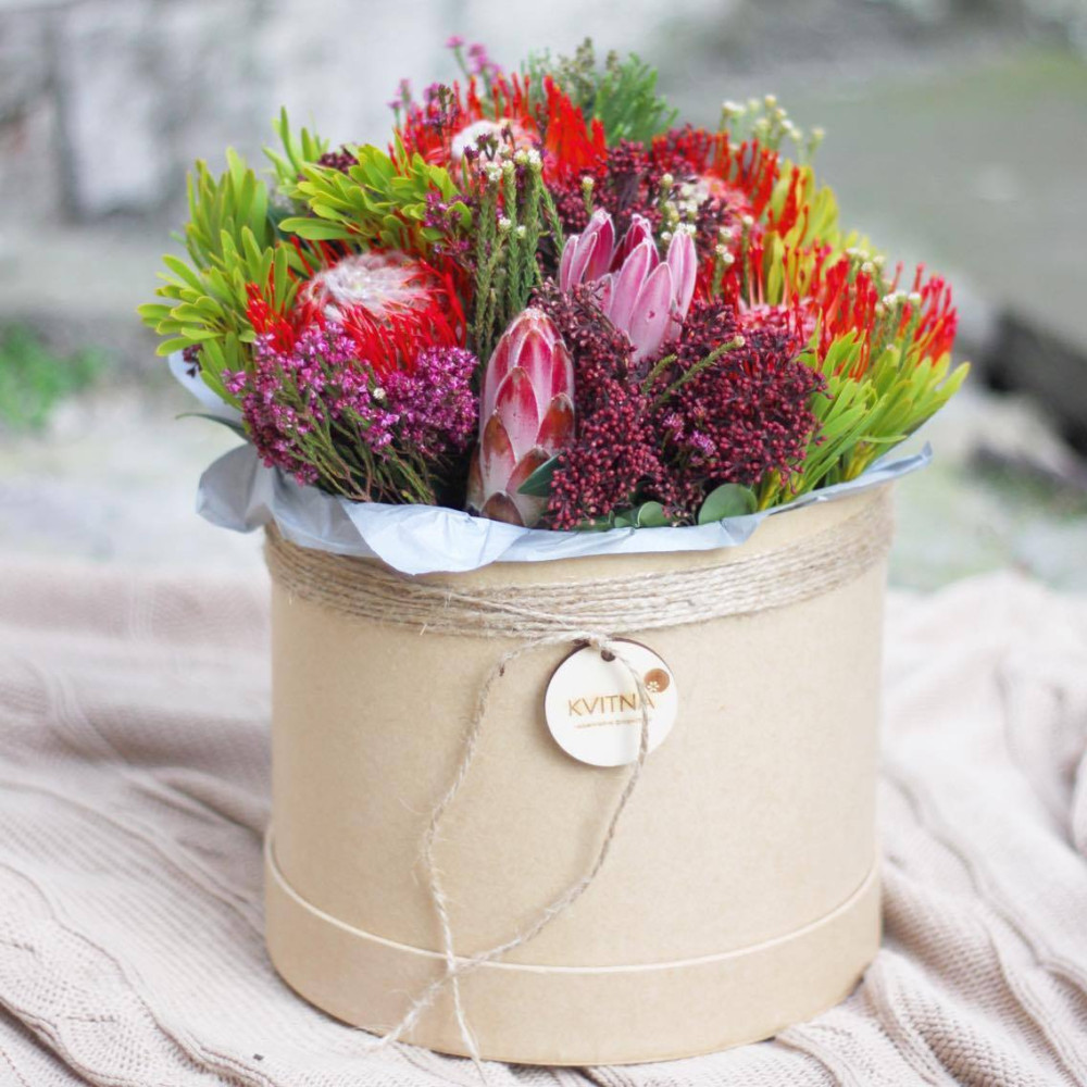 Нехай композиція (коробка, кошик, сніп) з квітами від Квітна тішить Вас якнайдовше!