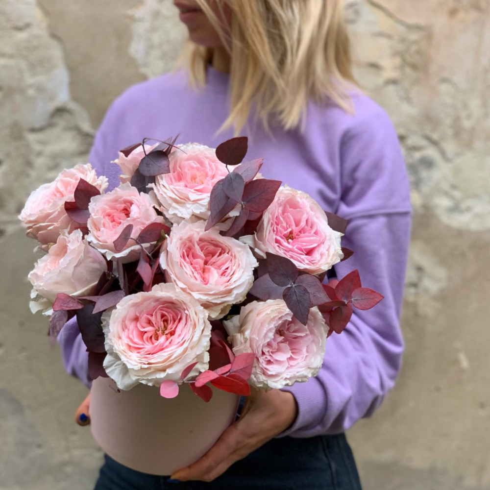 Японські піоновидні троянди «Цумугі» в шляпной коробці