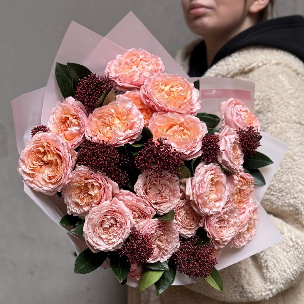 Квіти: Троянда піоновидна кущова сорту Juliet, Скімія