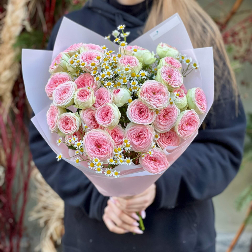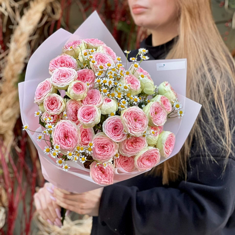 - Як замовити Кущова піоновидна троянда з танацетумом у букеті «Солоденькі зірочки»? ❯