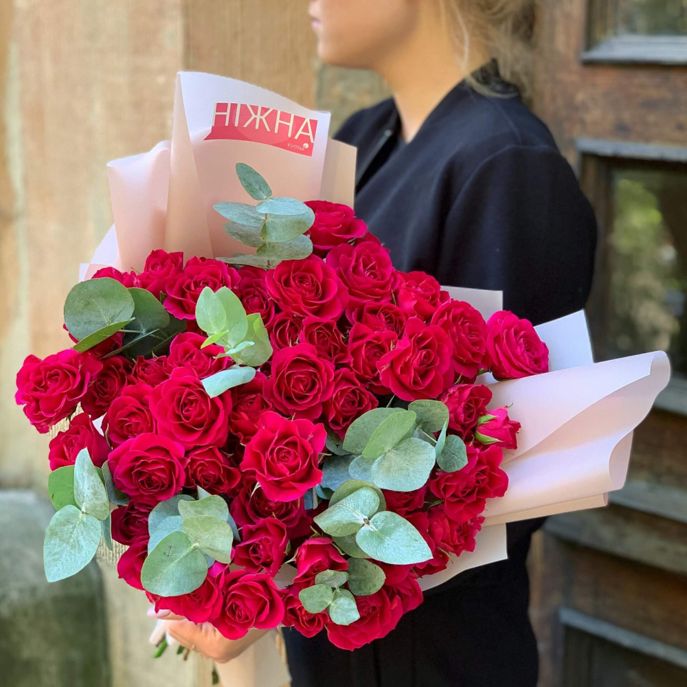 - Як замовити 21 гілка кущової троянди у букеті «Яскравий рум‘янець»? ❯