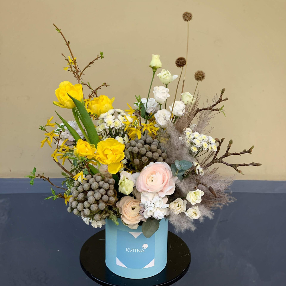 Нехай композиція (коробка, кошик, сніп) з квітами від Квітна тішить Вас якнайдовше!