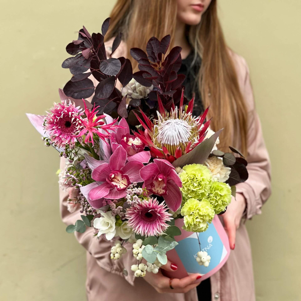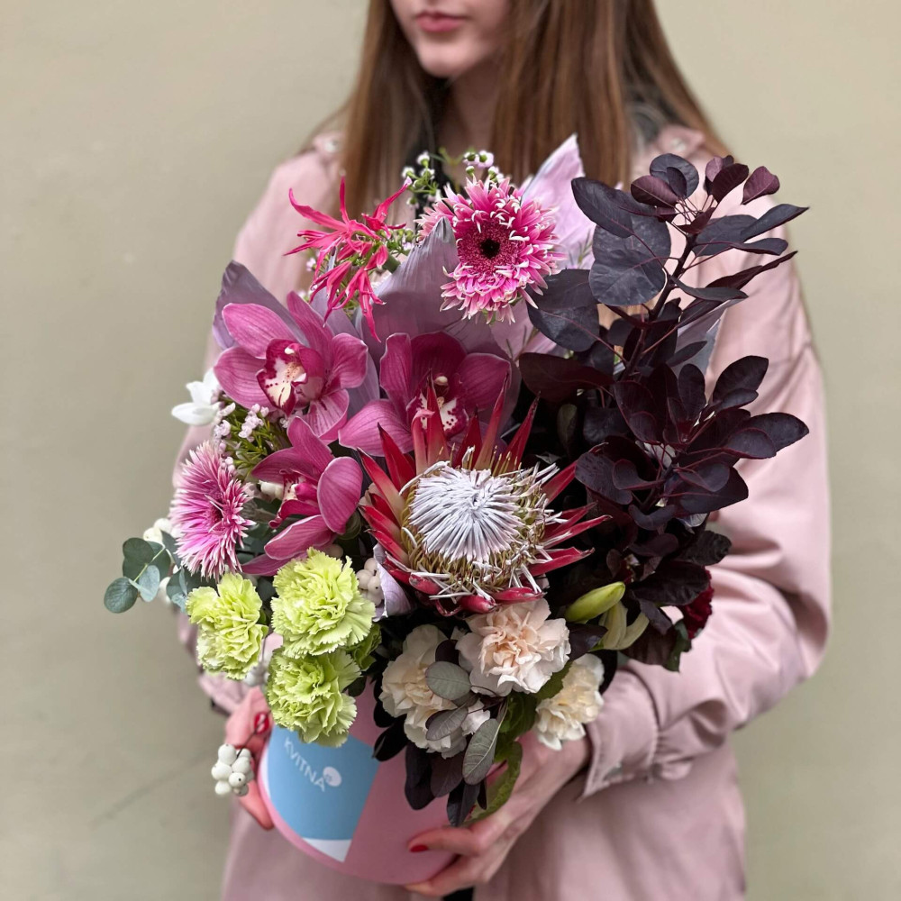 Нехай композиція (коробка, кошик, сніп) з квітами від Квітна тішить Вас якнайдовше!
