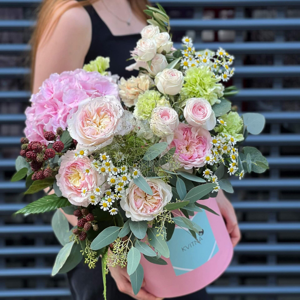 Квіти: Гортензія, Троянда піоновидна, Діантус, Рубус, Евкаліпт, Танацетум, Панікум, Троянда кущова