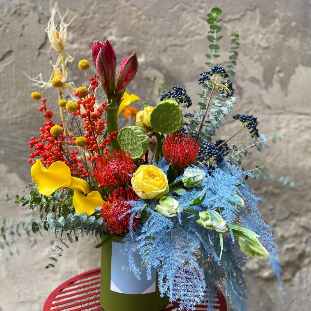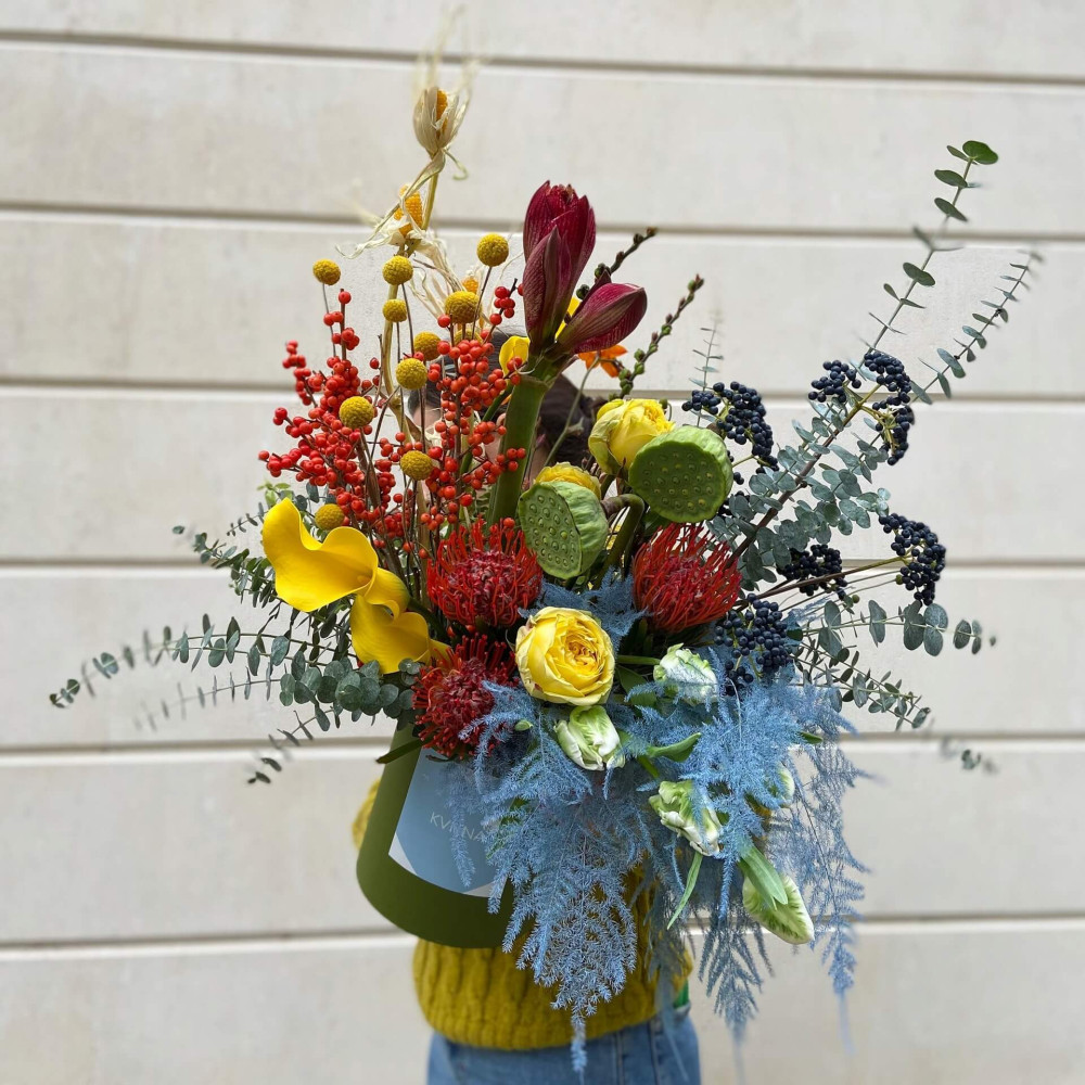 Нехай композиція (коробка, кошик, сніп) з квітами від Квітна тішить Вас якнайдовше!