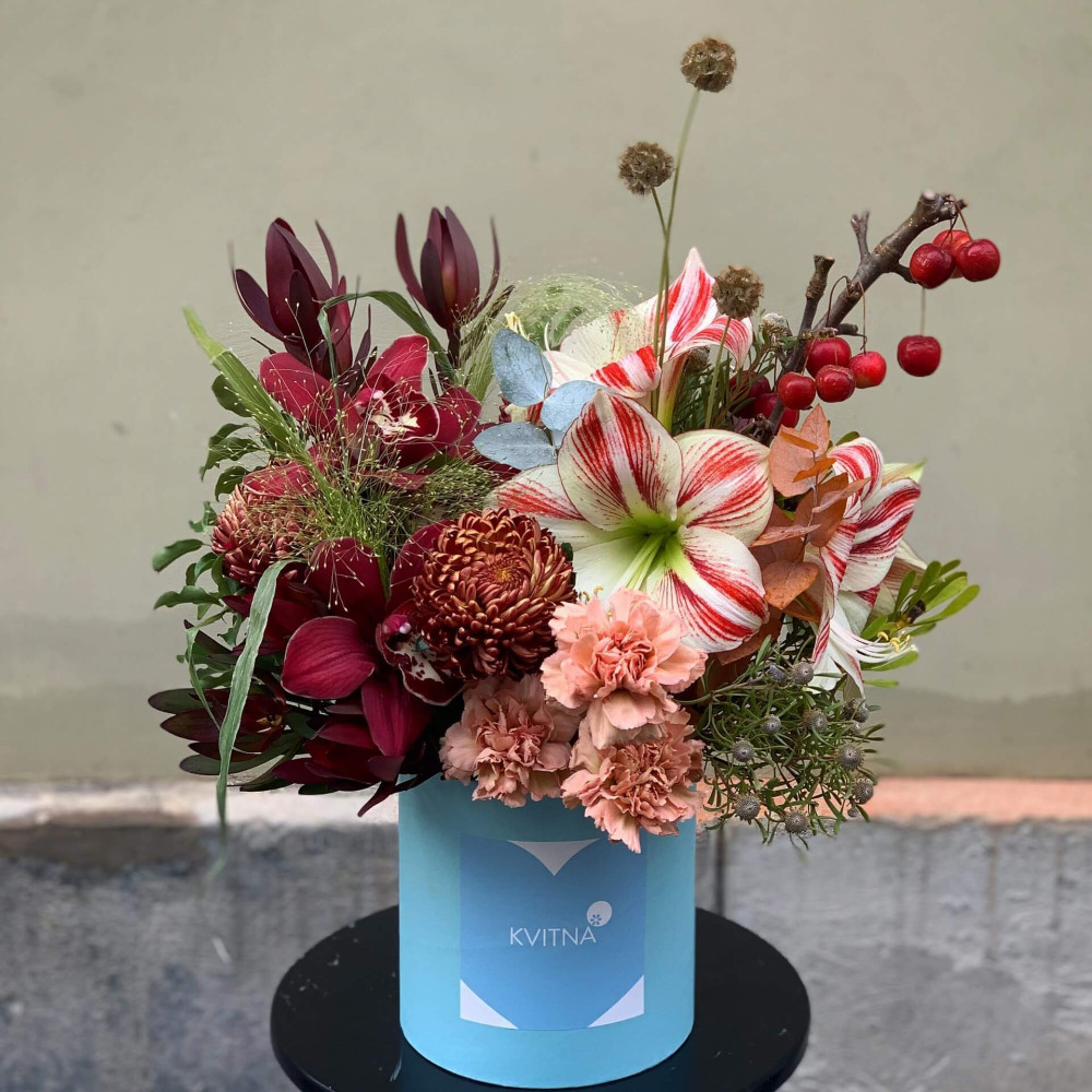 Нехай композиція (коробка, кошик, сніп) з квітами від Квітна тішить Вас якнайдовше!
