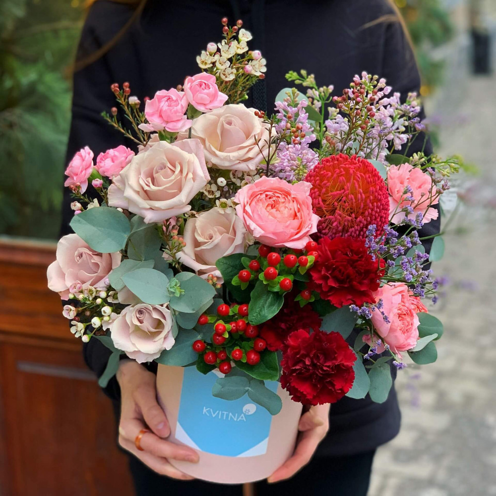 Нехай композиція (коробка, кошик, сніп) з квітами від Квітна тішить Вас якнайдовше!