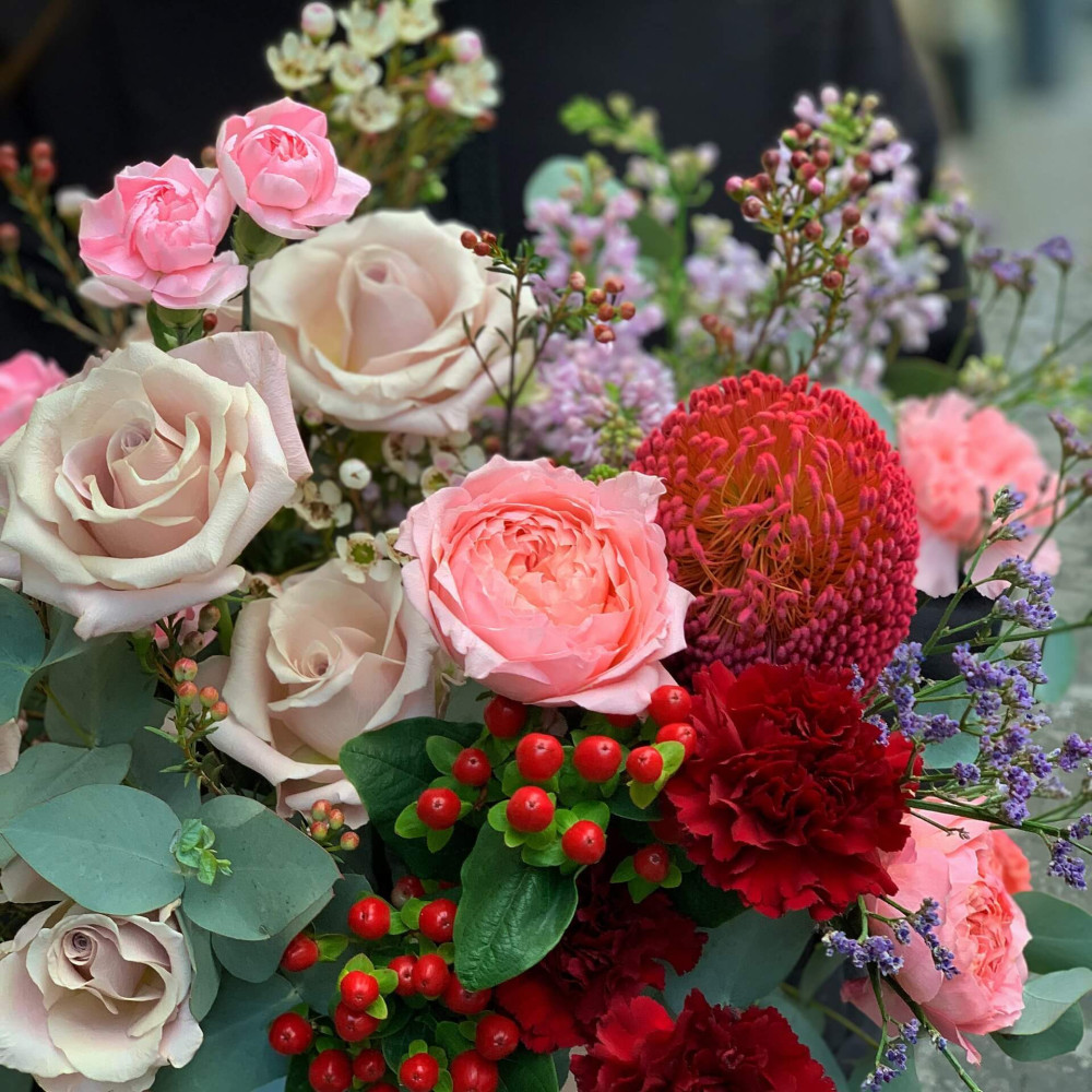 Квіти: Банксія, Хіперикум, Троянда, Діантус, Евкаліпт, Бузок, Хамелаціум
