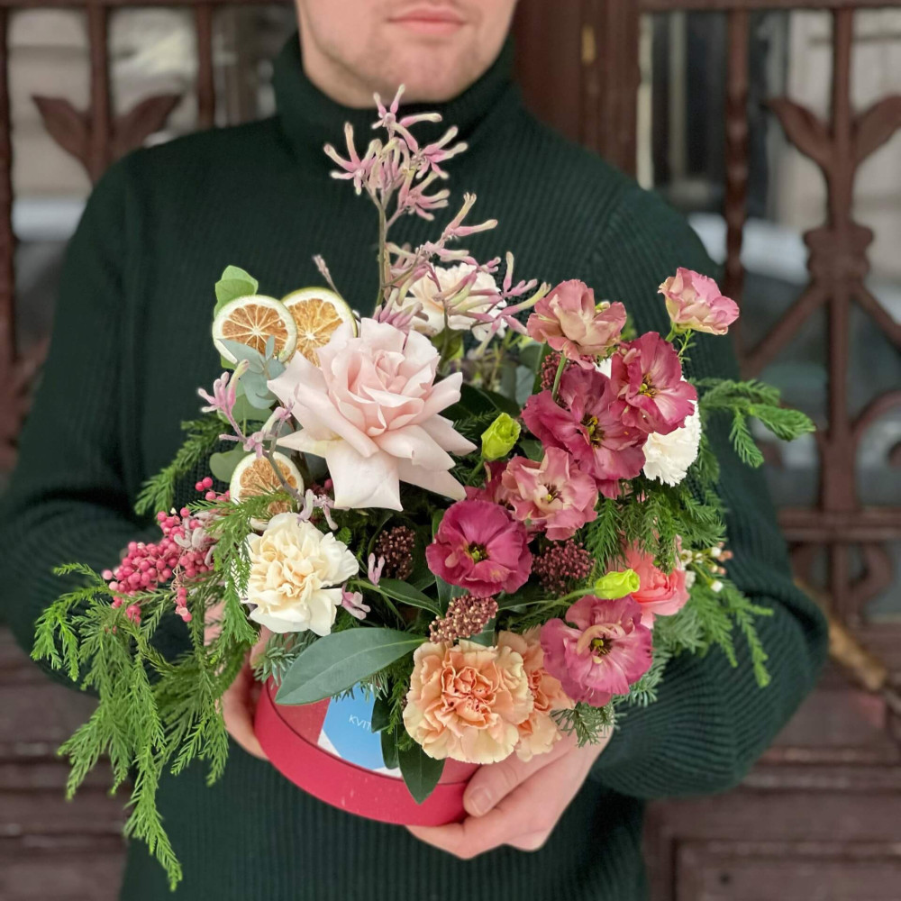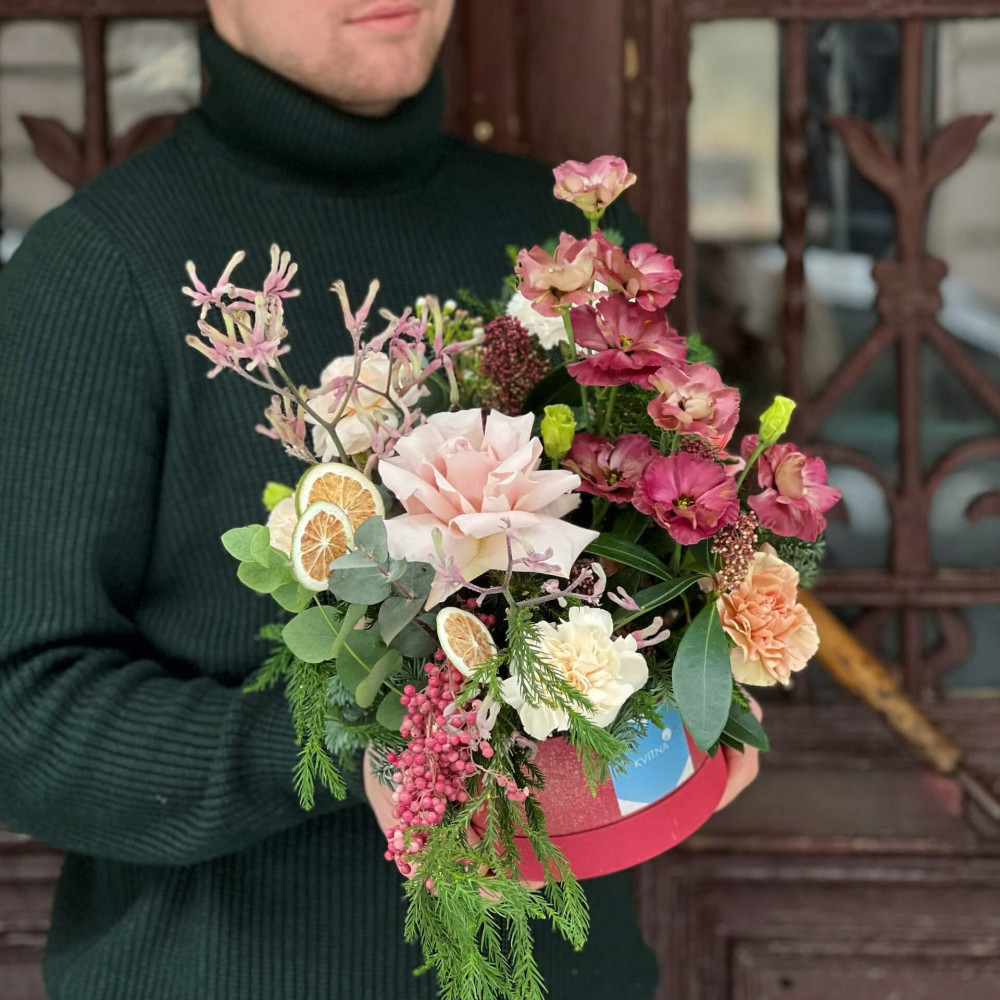Нехай композиція (коробка, кошик, сніп) з квітами від Квітна тішить Вас якнайдовше!