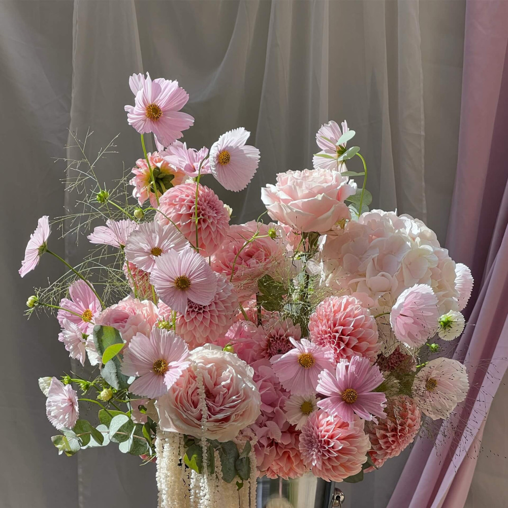 Квіти: Троянда піоновидна, Гортензія, Космея, Жоржина, Амарант хвостатий, Евкаліпт