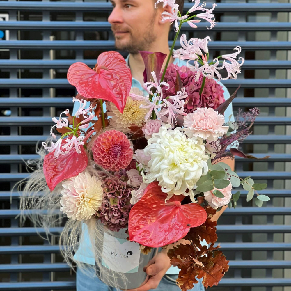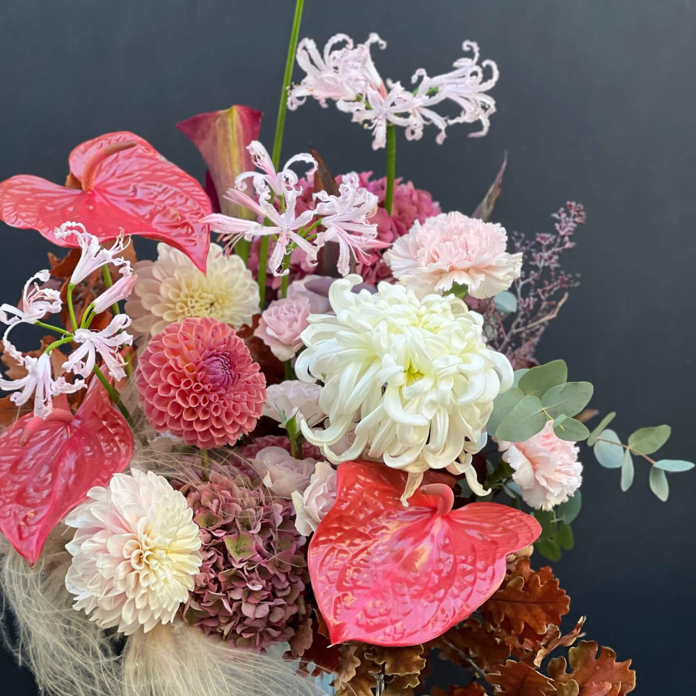 Квіти: Антуріум, Гортензія, Неріне, Жоржина, Хризантема, Діантус (Гвоздика), Евкаліпт, Троянда кущова, Стіфа