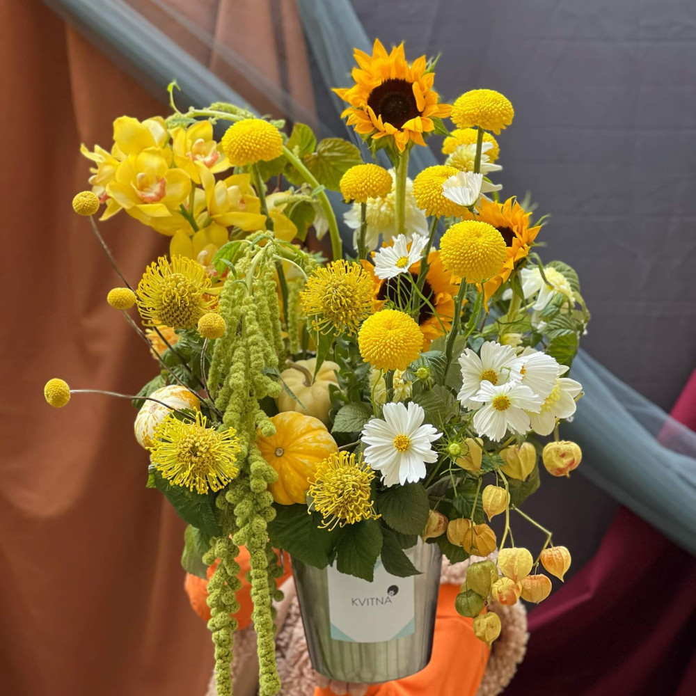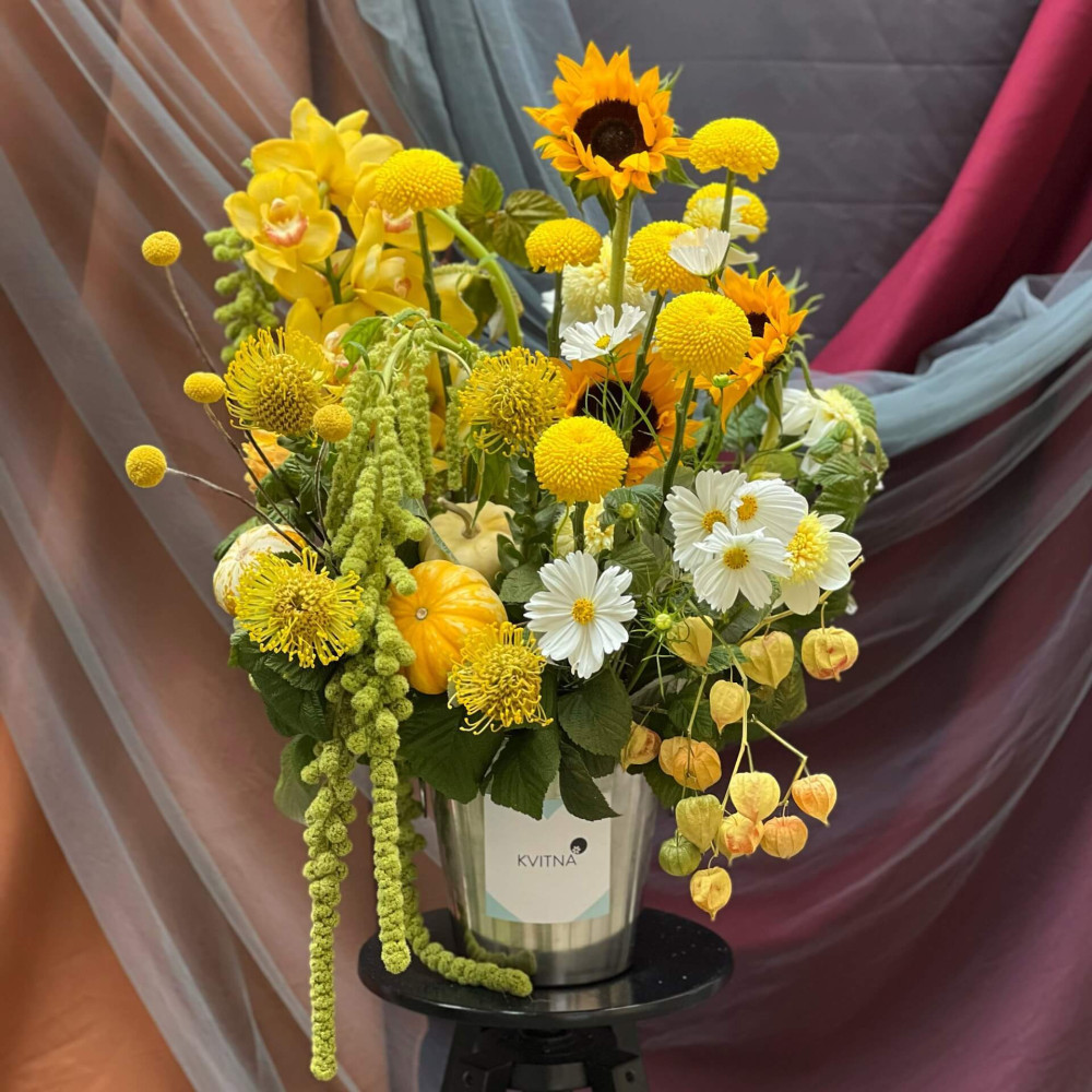 Нехай композиція (коробка, кошик, сніп) з квітами від Квітна тішить Вас якнайдовше!