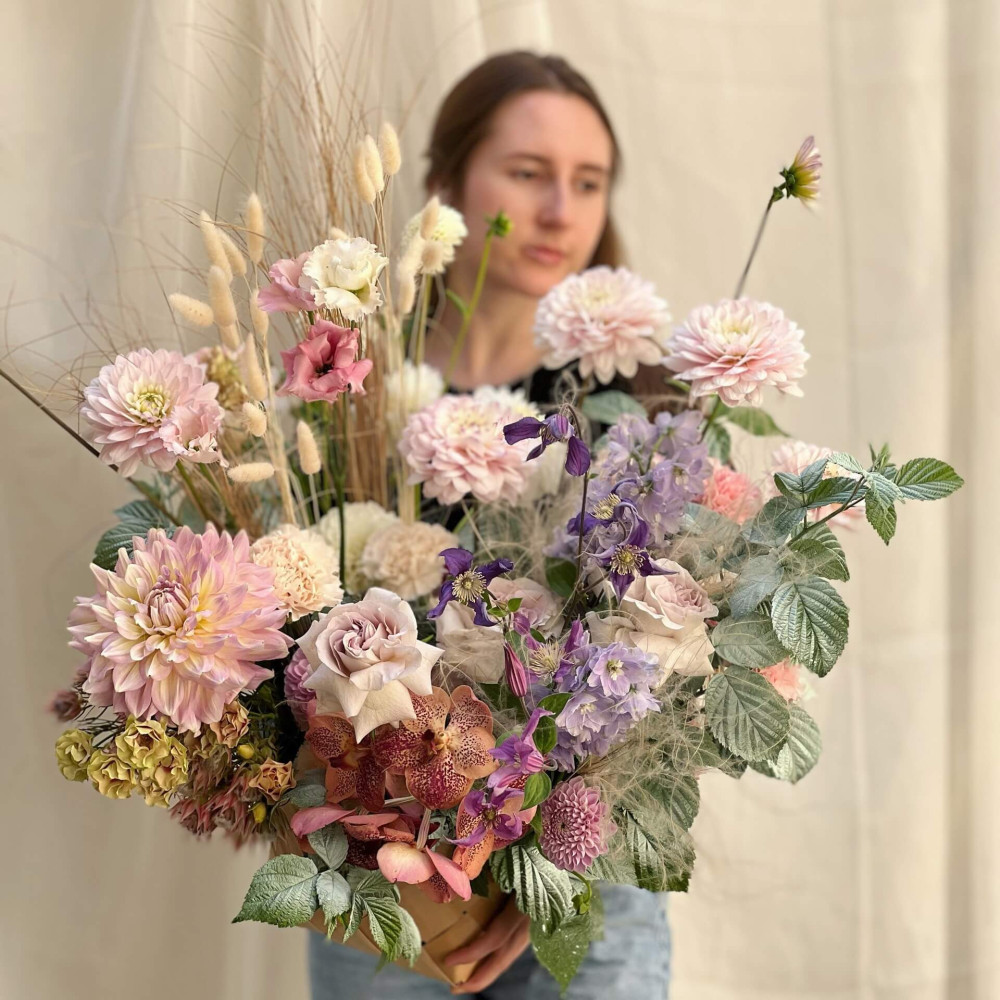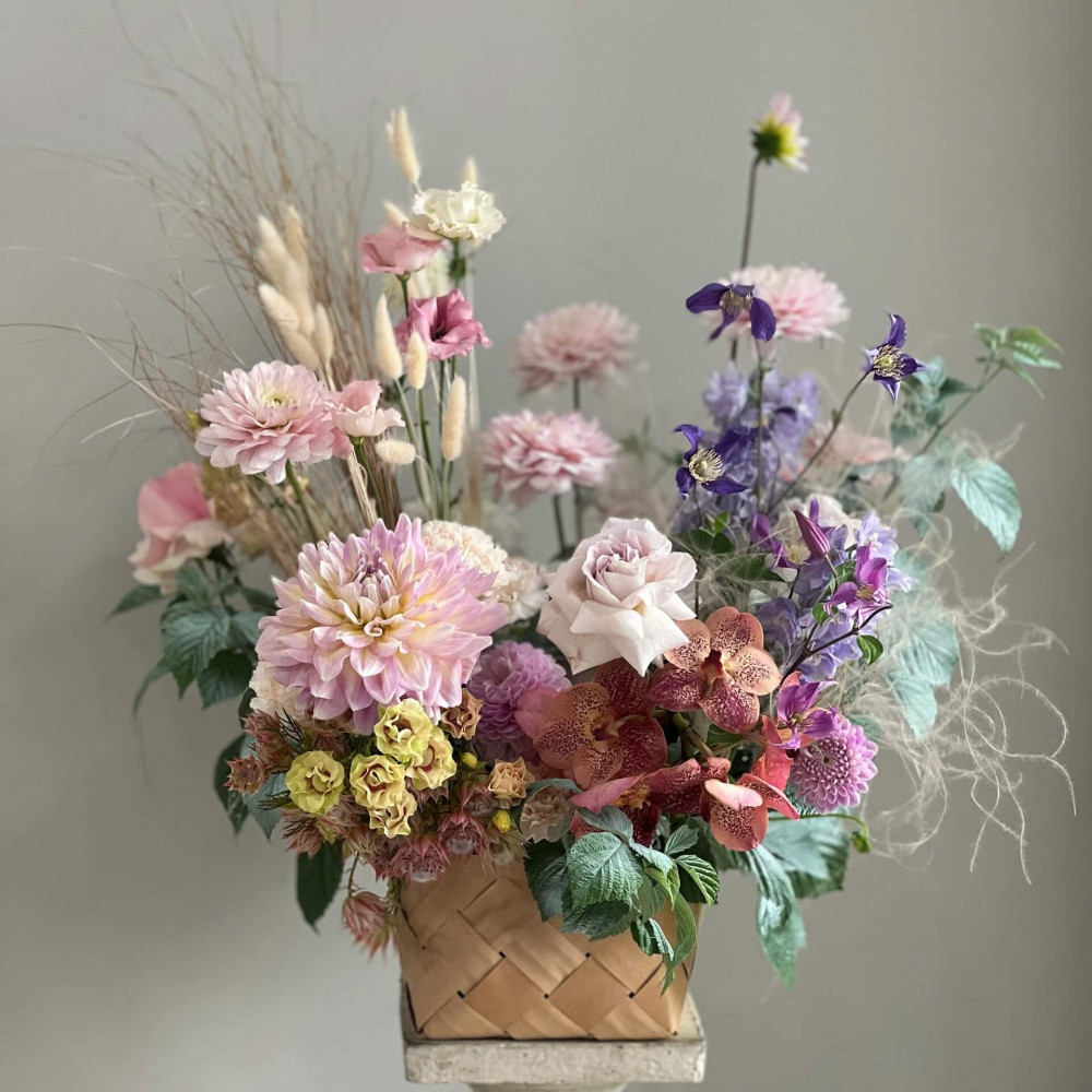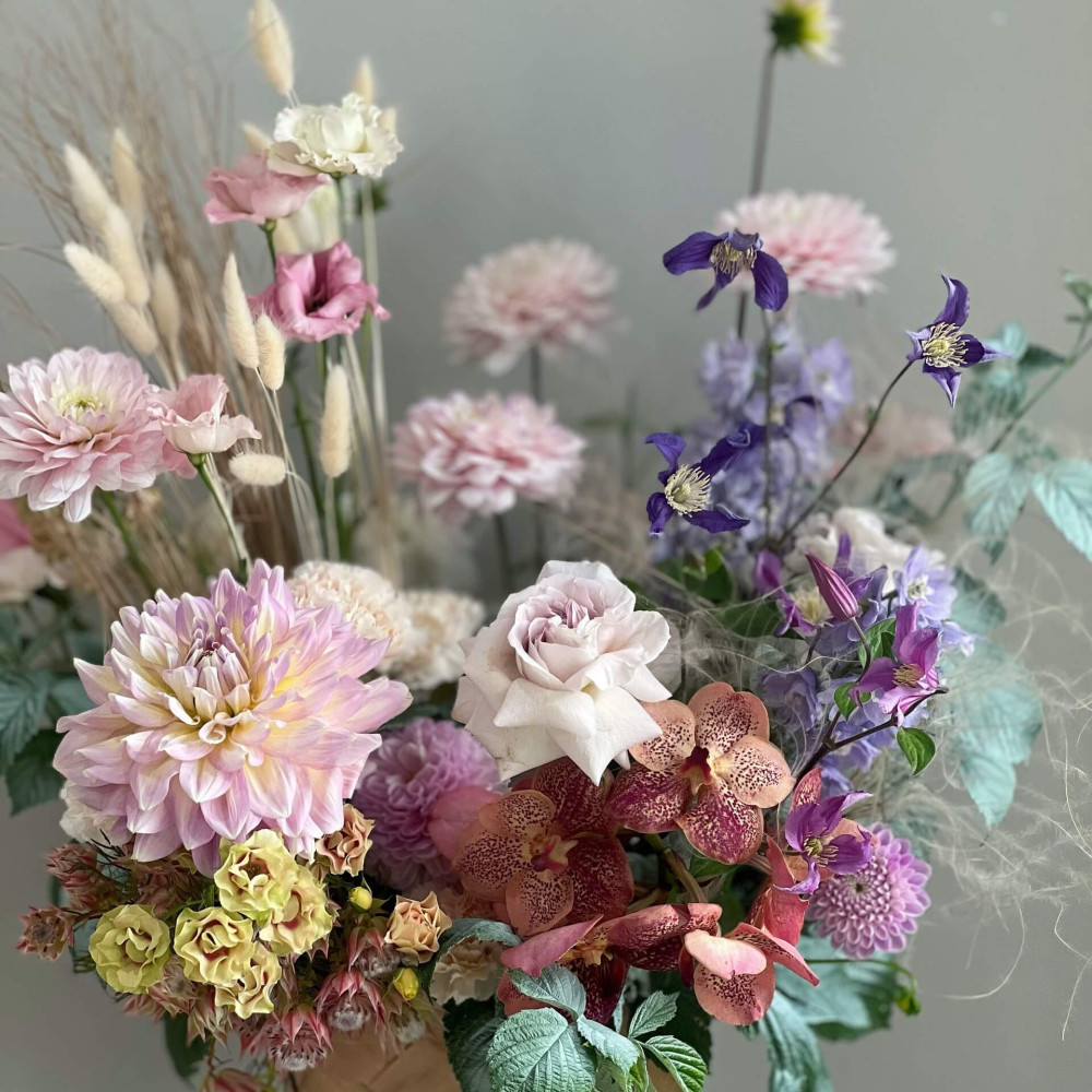 Квіти: Троянда, Клематіс, Жоржина, Малина (листя), Дельфініум, Лагурус, Ванда, Серрурія, Еустома, Берграс