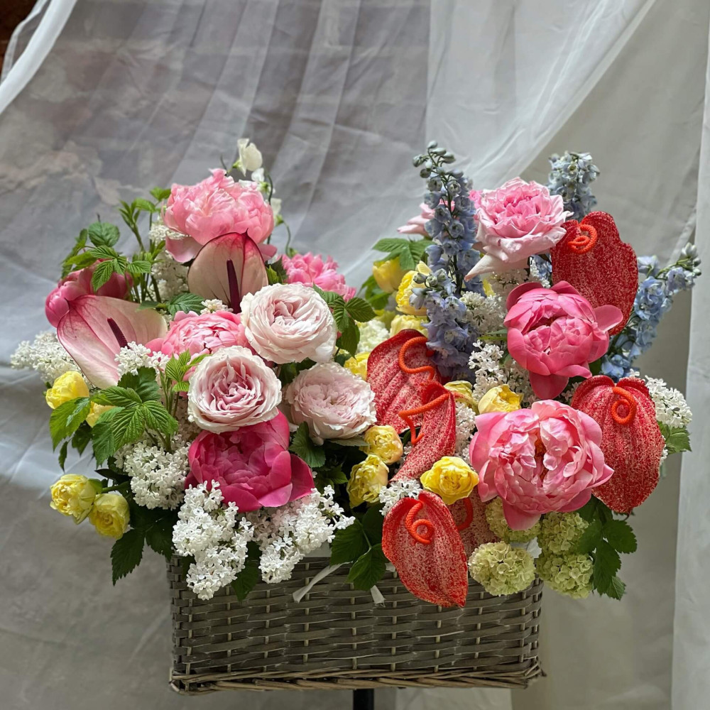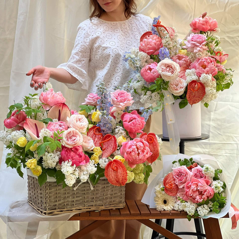 Квітковий сет з трьох позицій: великий квітковий кошик, велика коробка з квітами та букет.