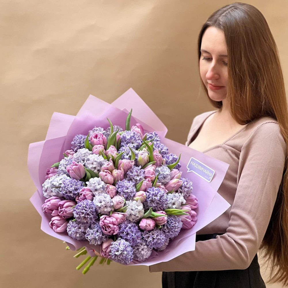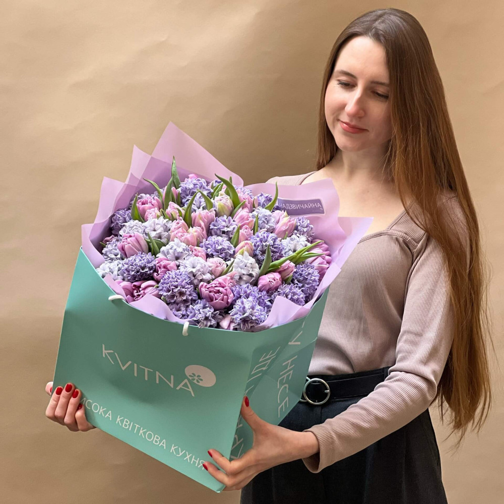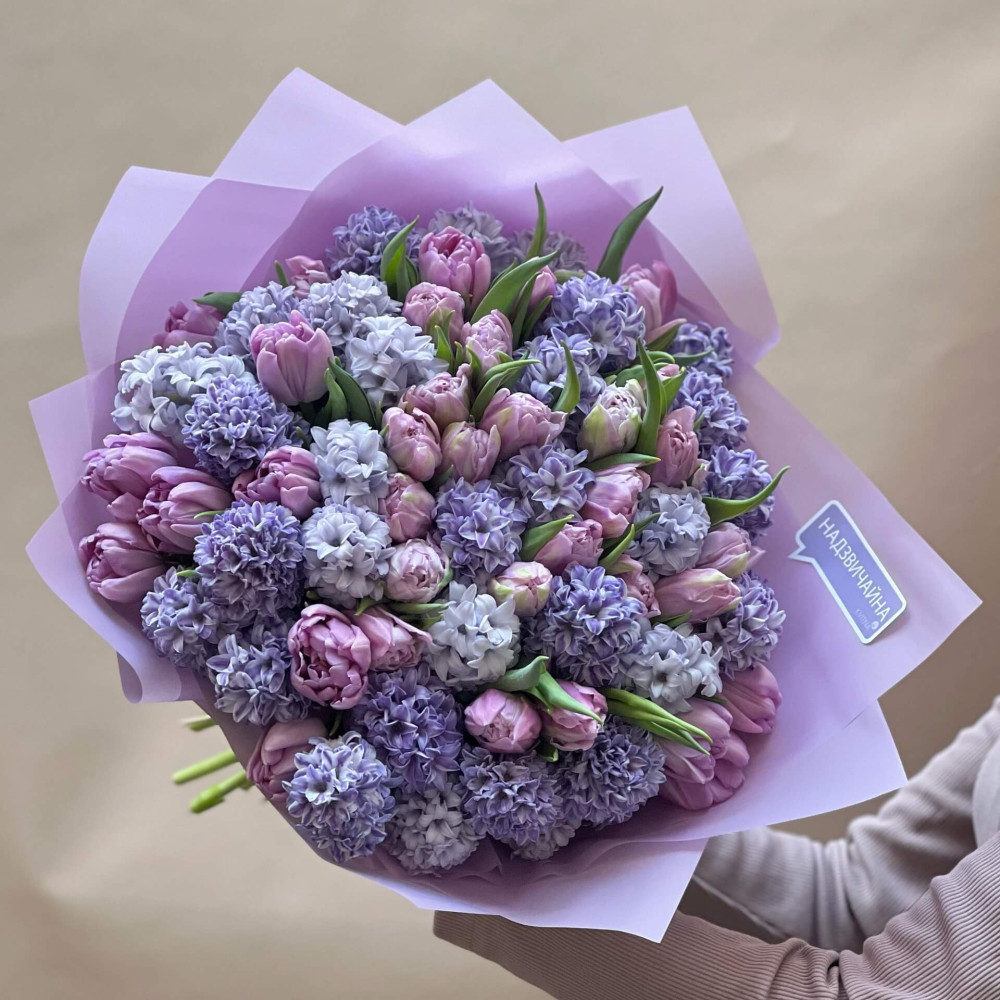 Цей букет в першу чергу про аромат! Ніжно-лавандові пахучі гіацинти в поєднанні з бузковими махровими тюльпанами приносять з собою хмару справжнього солодкого аромату весни, так, як пахне сад у весняний теплий вечір.