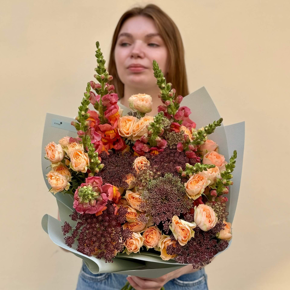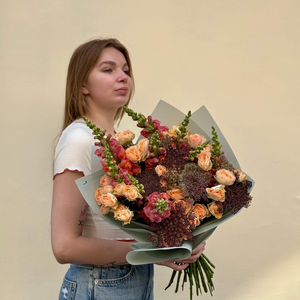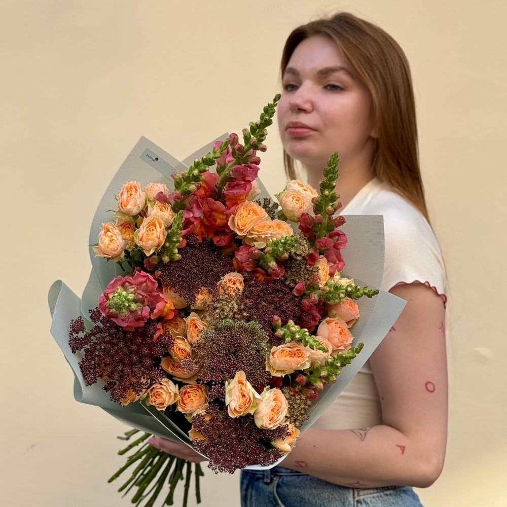 - Як замовити Літній букет з кущовою півонієвидною трояндою «Мандарин у шоколаді»? ❯