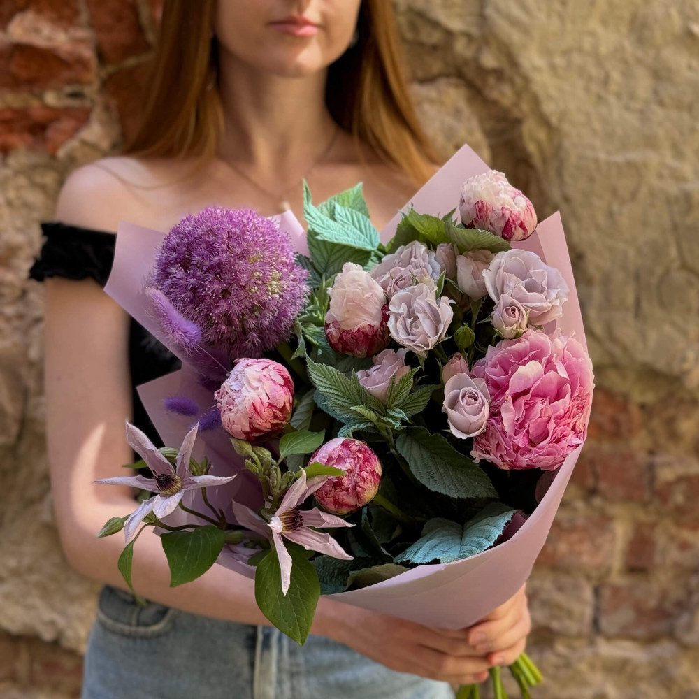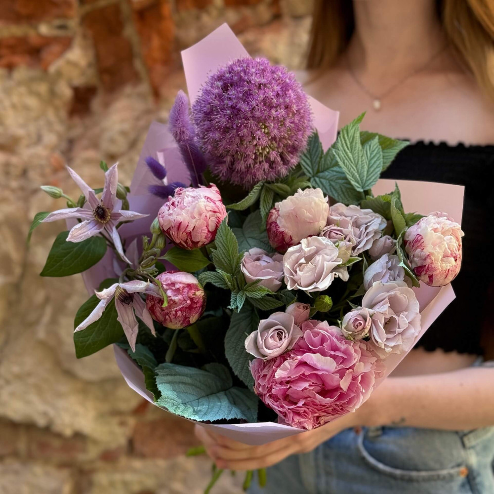 Квіти: Алліум, Півонія, Троянда кущова, Клематіс, Малина (листя)