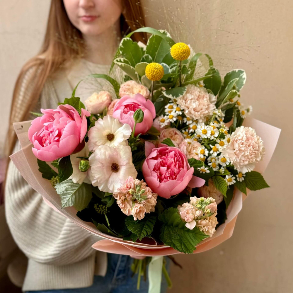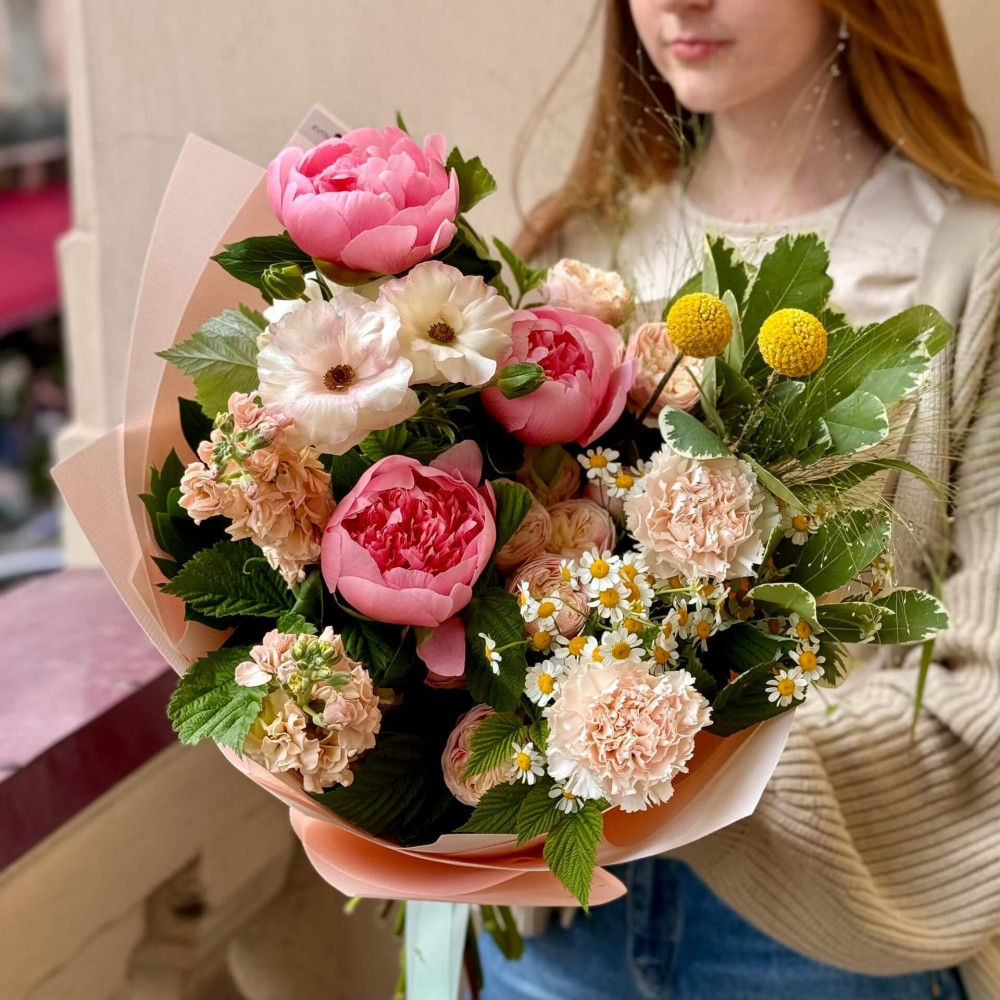 - Як замовити Літній букет з півоніями та матіолою «Кремова рожевинка»? ❯