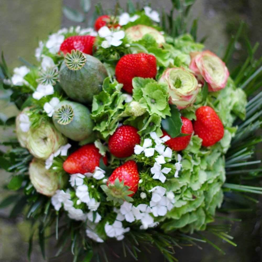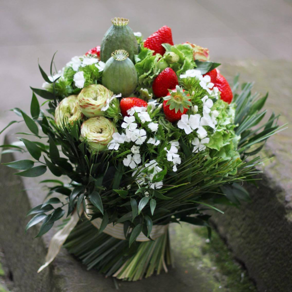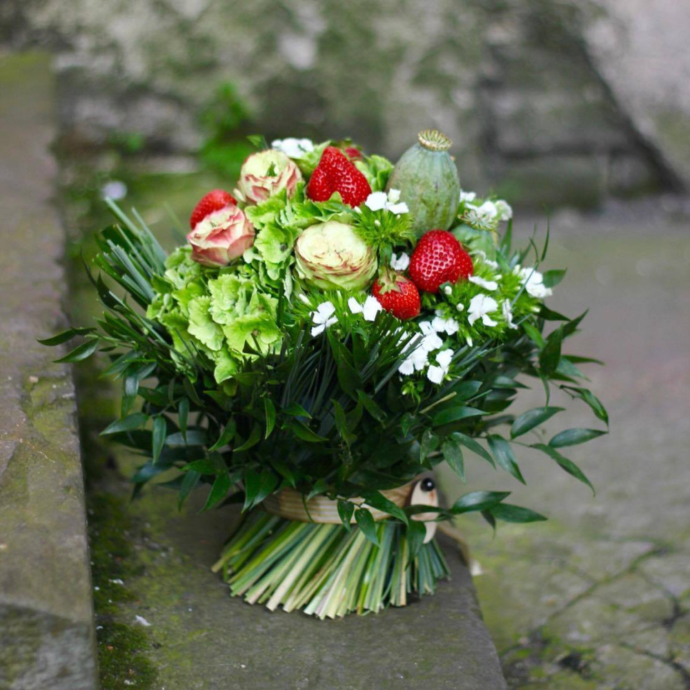 Букет-сніп в берграсі із зеленої гортензії і полуниці