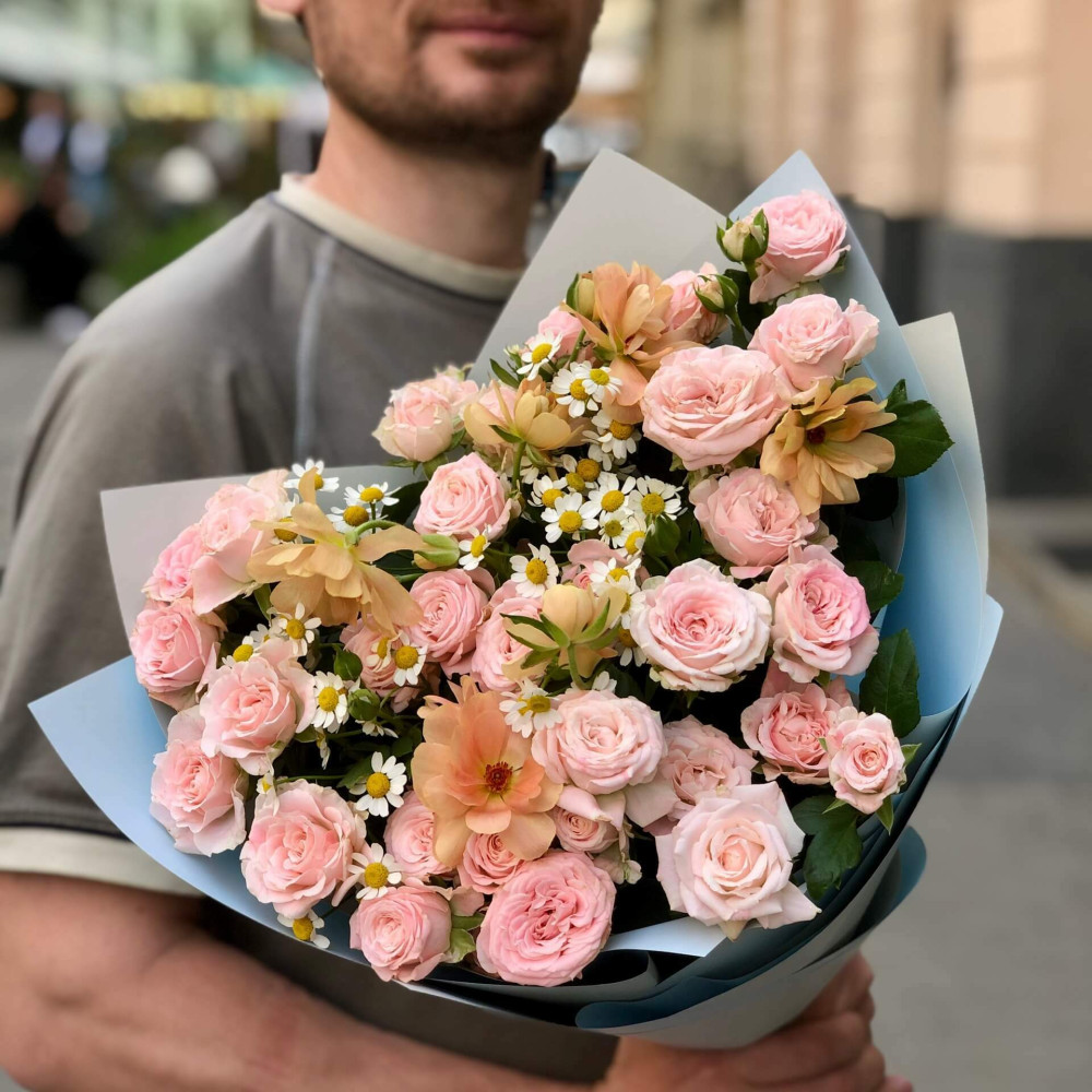 - Як замовити Мерехтливий персиковий букет з кущовою трояндою «Світанкова ніжність»? ❯