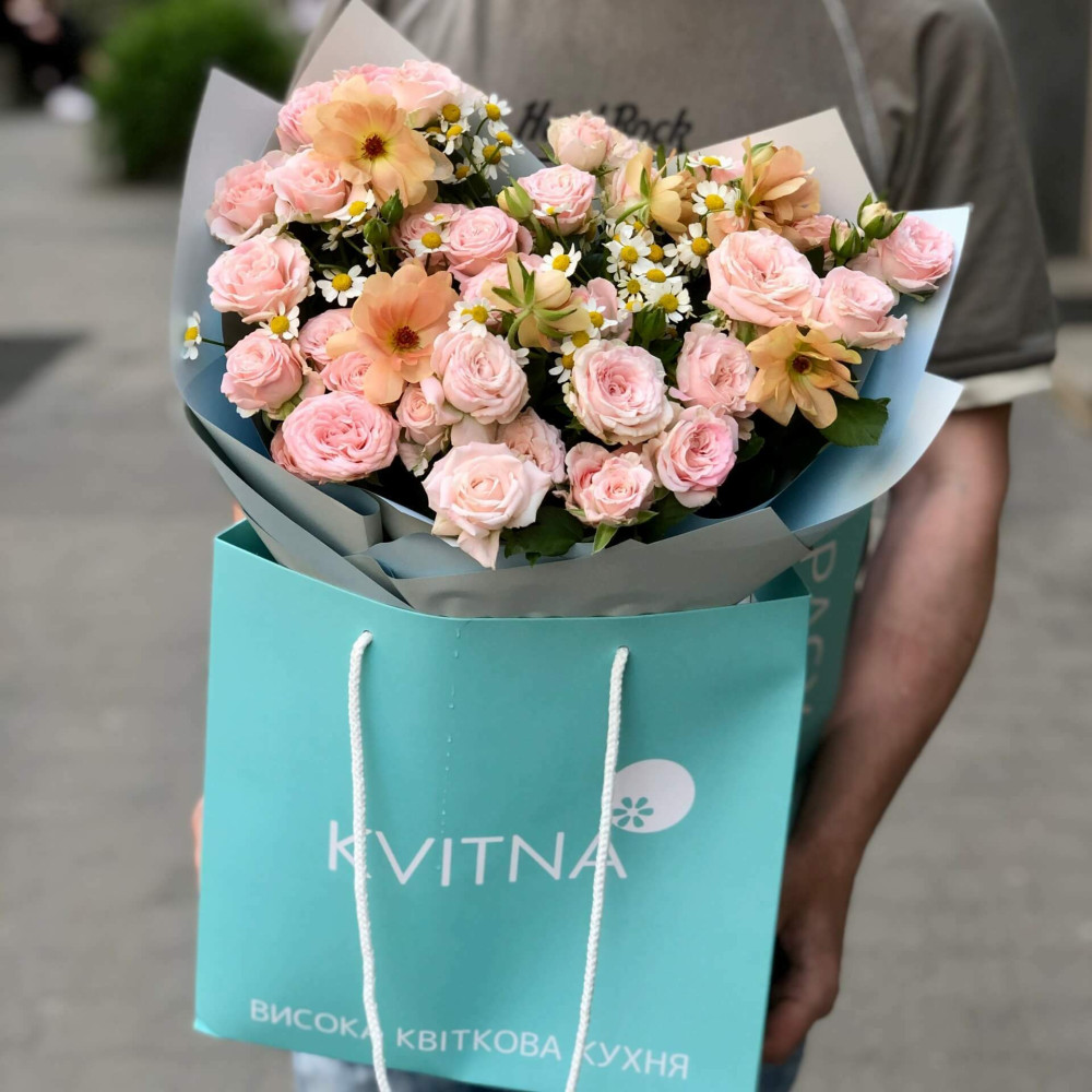 - Букети від Kvitna доставляються у фірмовому пакуванні, яке потрібно зняти при установці квітів у вазу. Не зрізайте стрічку, звʼязуючу букет, щоб зберегти його форму.