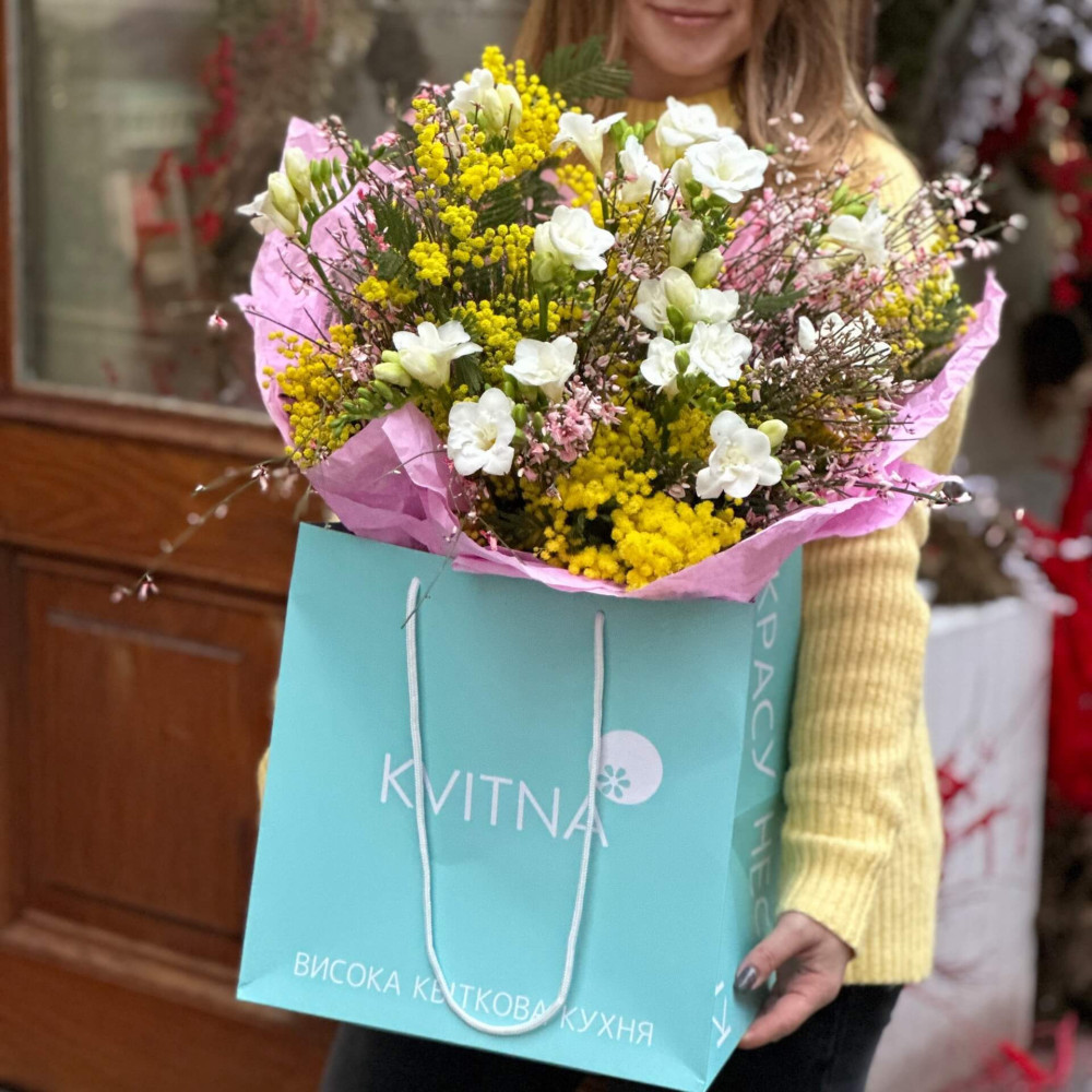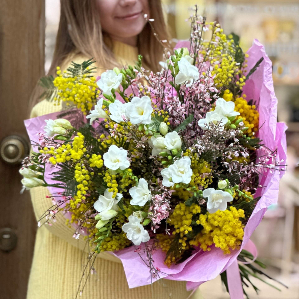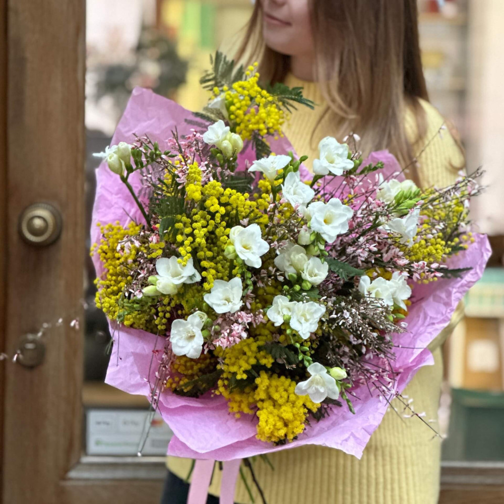 - Як замовити Мерехтливий весняний букет із мімози, фрезій та геністи «Ароматний пухнастик»? ❯