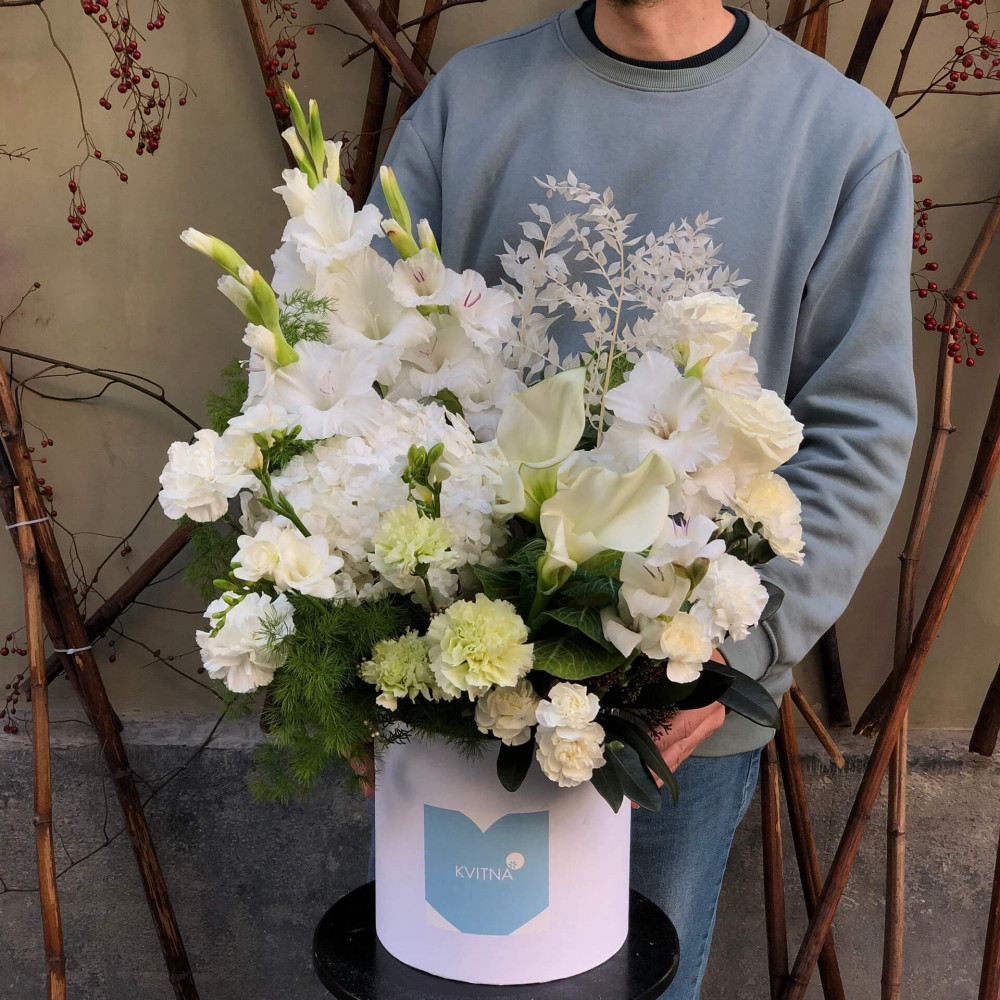 - Композиції з квітів від Kvitna (такі як коробка, кошик, сніп) зібрані у флористичній піні, просоченій водою, тому вони не потребують вази. Оскільки вода випаровується, потрібно підливати в піну по склянці прохолодної води щодня.