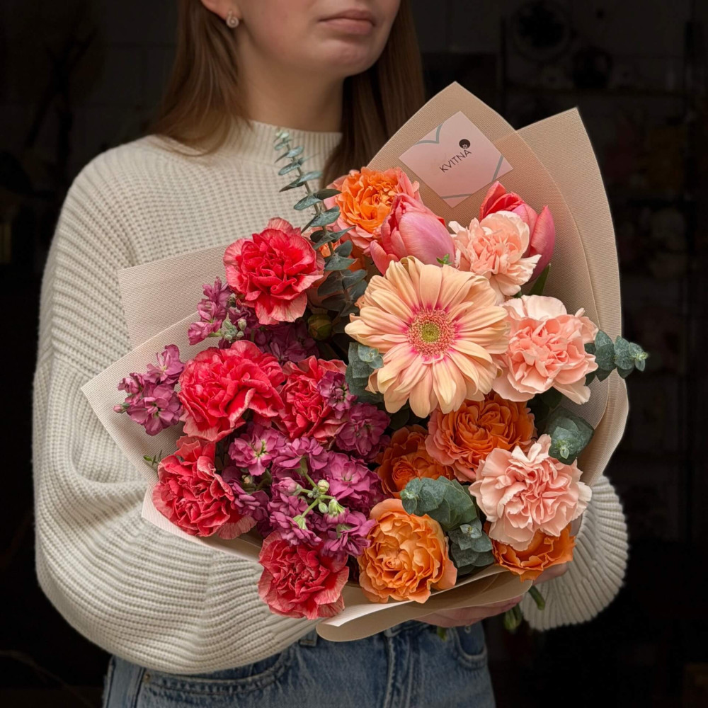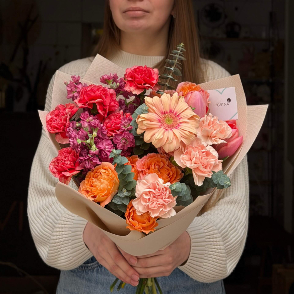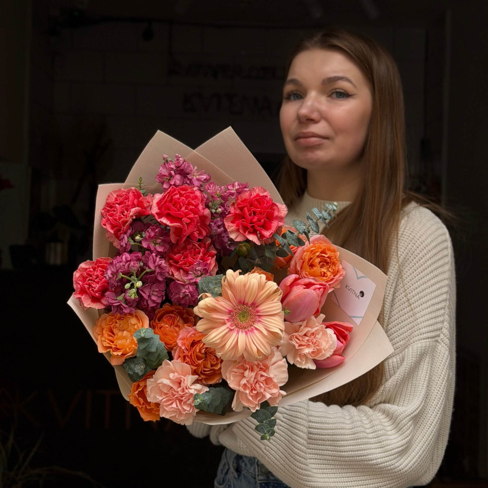 І це, до речі, зовсім не обов'язково плюси, це особливості, які потрібно розуміти. Тоді і вибір «де купити букет у Львові» зробити буде значно простіше.- Кожен букет Kvitna унікальний. Це означає, якщо Ви замовите у нас якийсь із букетів на сайті, то Ви не отримаєте точнісінько такий же. Деяких це бентежить, такі люди не хочуть «ризикувати», бажають «в точності, як на світлині». У «Квітна» кожен букет — це творчий пошук, це захоплення, злиття з квітами, образом одержувача і завданням. Так, ми можемо прийняти за вектор, зробити схожий букет, в тому ж стилі, кольоровій гамі, з тих самих квітів ... Але нам нудно робити за шаблоном. Адже букет, представлений на зображенні, робився для іншої людини, з іншого приводу, під інший настрій і натхнення. У Вас буде все по-іншому.