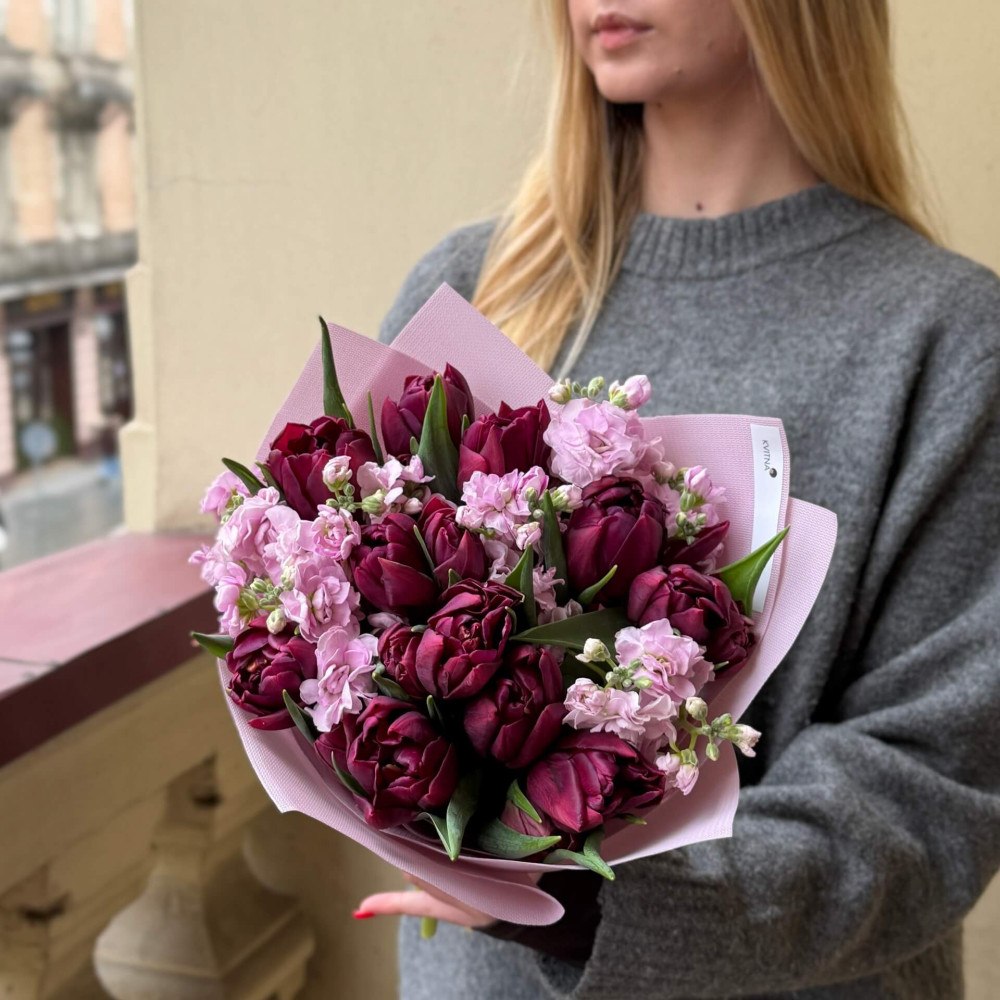 - Як замовити Мереживний букет з піоновидними тюльпанами «Доторкнутись до ніжності»? ❯