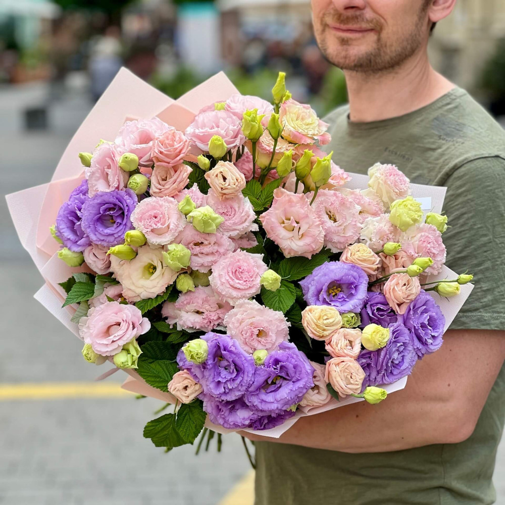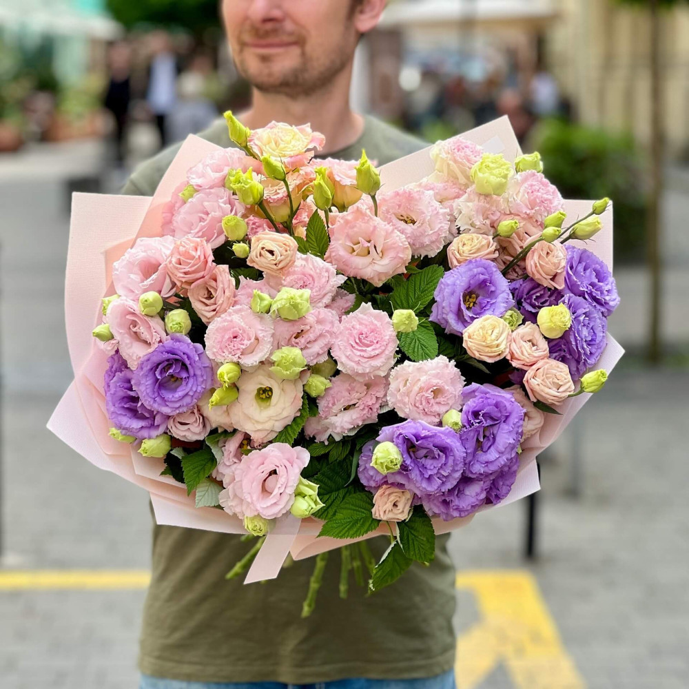 Різнокольоровий монобукет із 15 гілок персикової та фіолетової Еустоми (сорта Lisadora Apricot та Corelli Lavender). Букет із колекції 2025 року в середньому ціновому діапазоні. Зібраний ТОП-флористом Kvitna – Юрієм Захарчуком.
