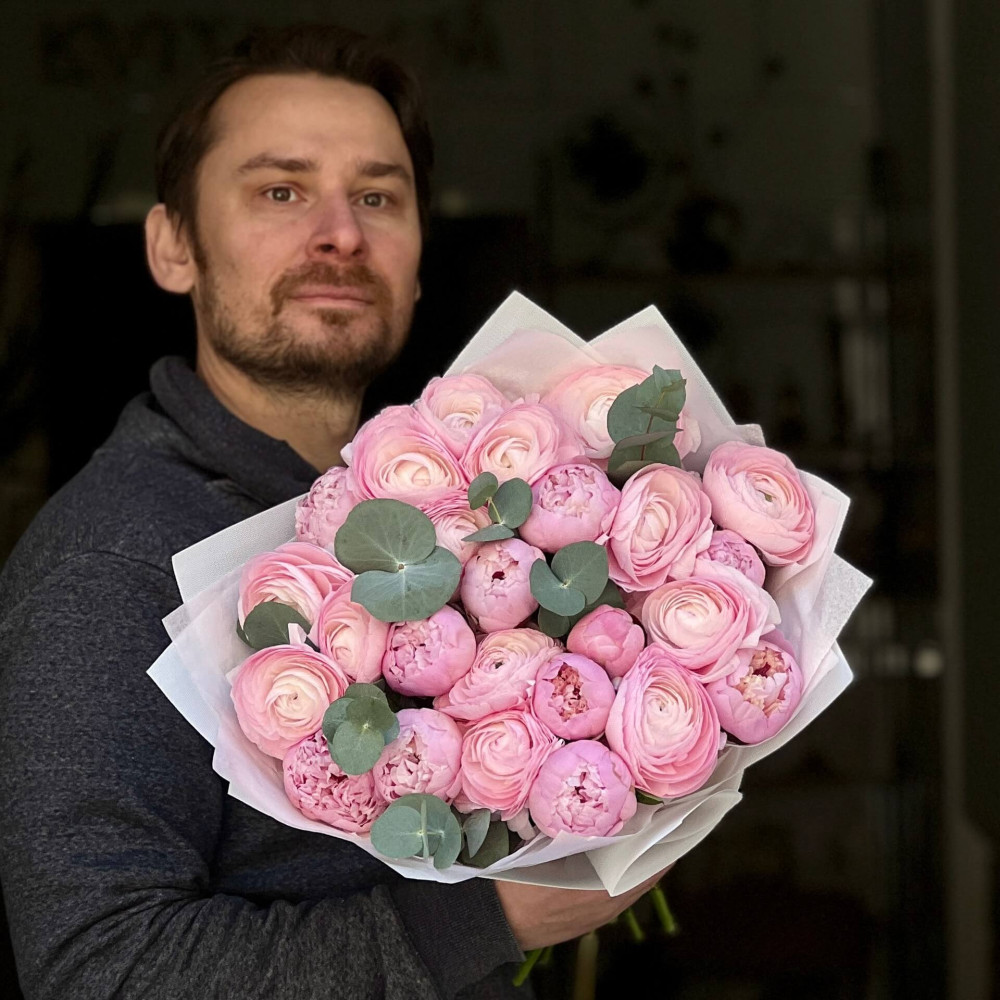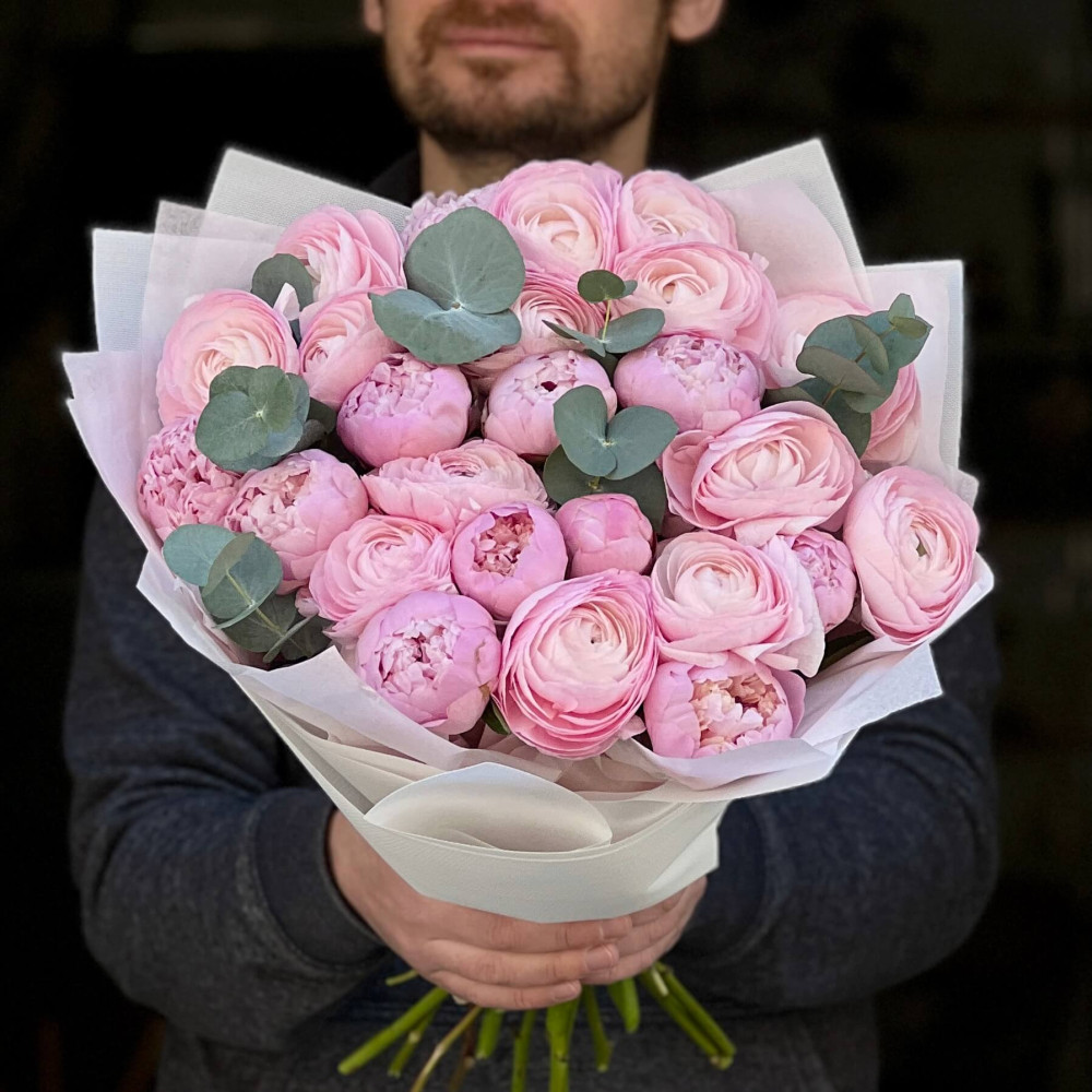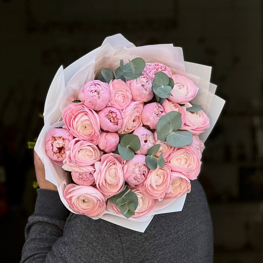 - Як замовити Мікс із 25 розкішних ранункулюсів та півоній у букеті «Рожева магія»? ❯