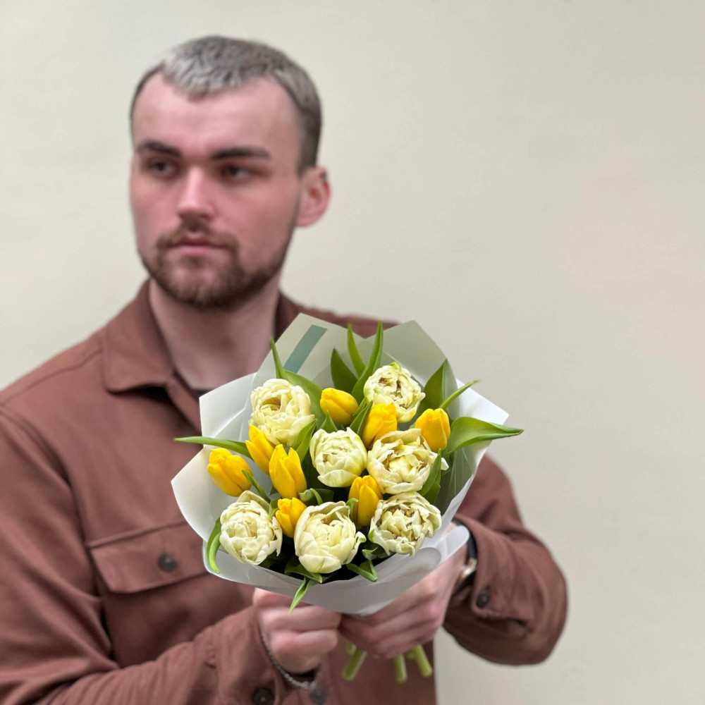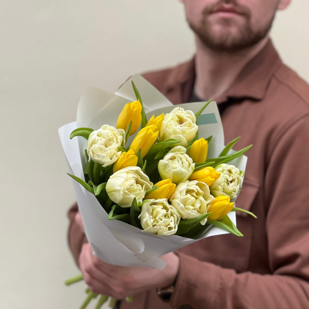 - Як замовити Мікс класичних та піоновидних тюльпанів у букеті «Промінчик березня»? ❯